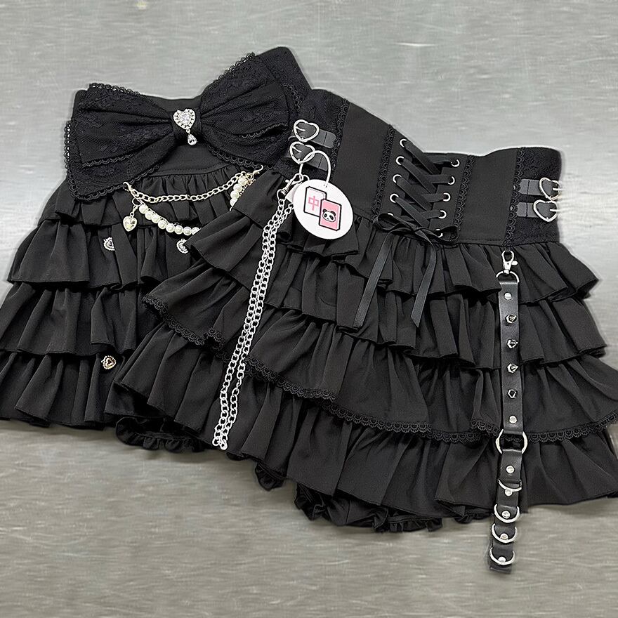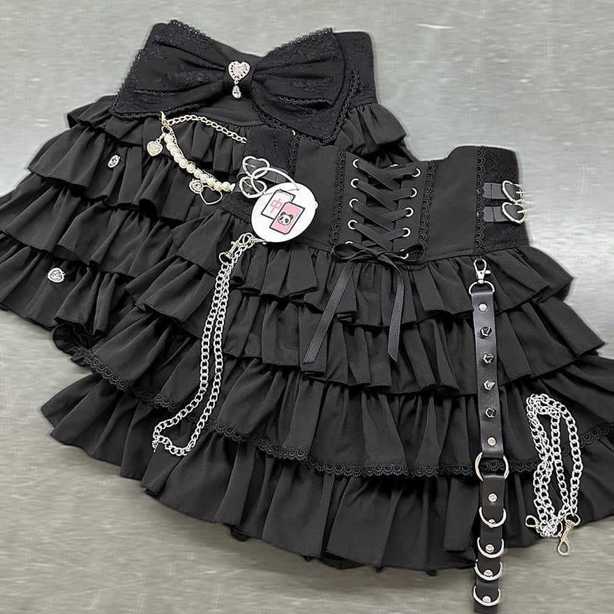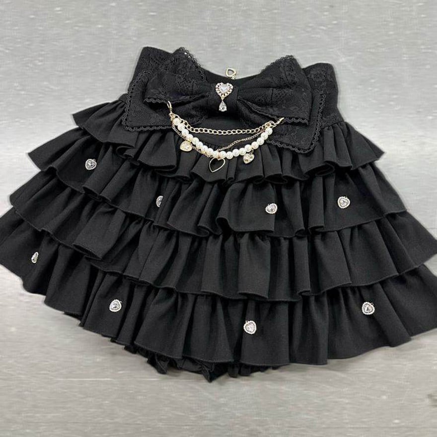 地雷系やゴシックロリィタに最適な、多層のティアードフリルが特徴的なミニスカートです。ボリューム感のあるシルエットが、足元を華奢に美しく見せてくれます。ウエストのリボン装飾やパール、ハートチャームなどの細やかなディテールが甘さを演出。ライブ衣装やコンカフェでの接客、特別な日の日常着として活躍します。
