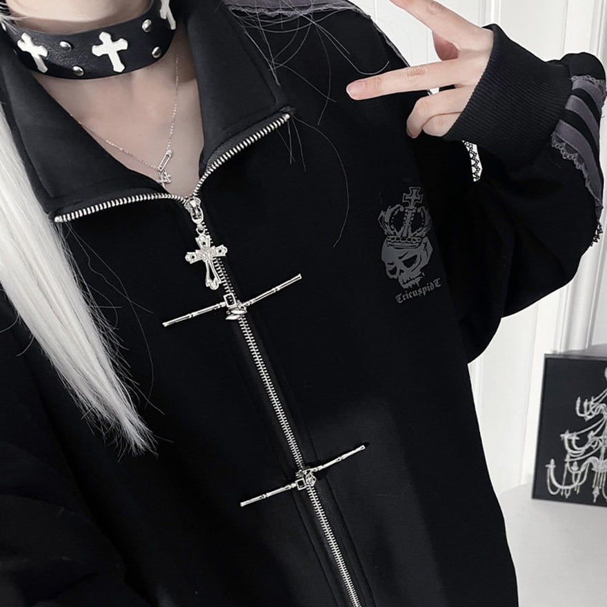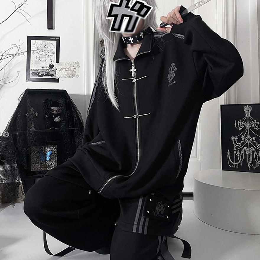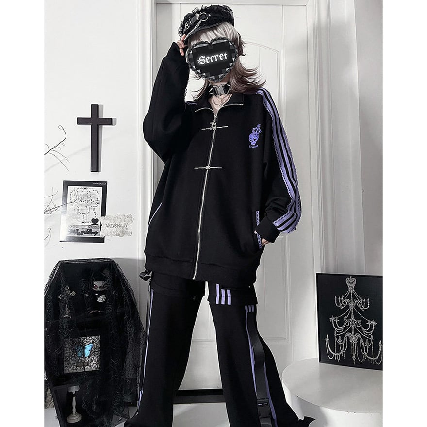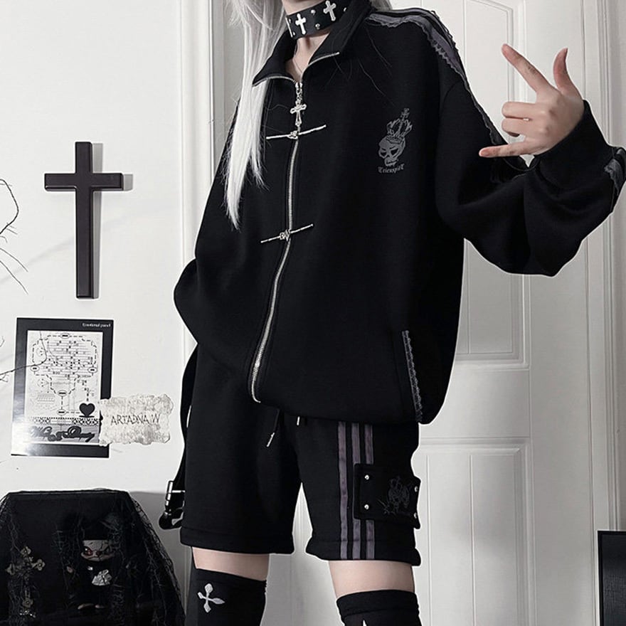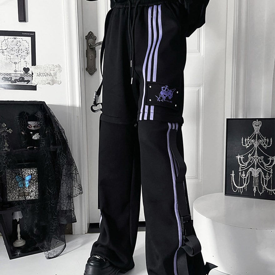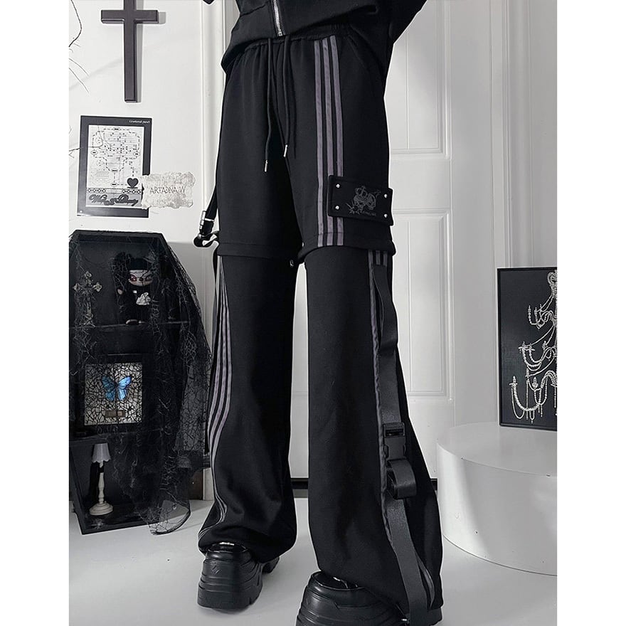 地雷系の2Way仕様ジャージボトムス単品です。ファスナーで半ズボンに切り替えられる機能性と、サイドのレースアップ風ラインがダークな可愛さを演出します。動きやすい素材でライブやイベントに最適です。一着で二通りのシルエットを楽しめる、着回し力抜群のアイテムです。