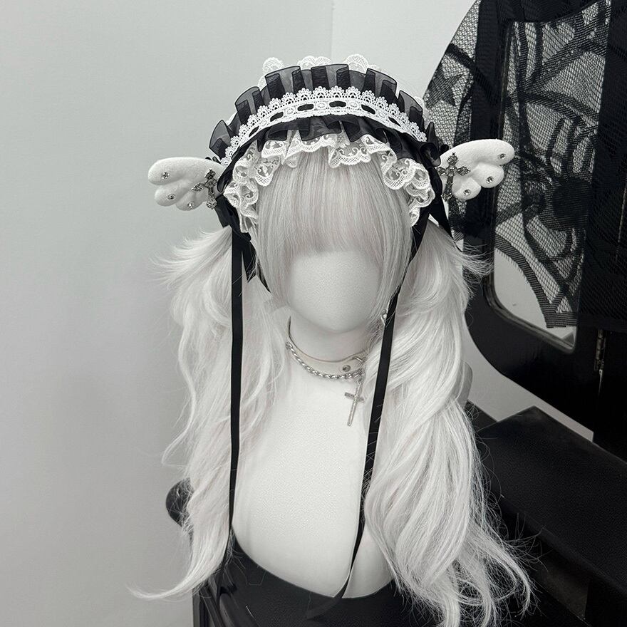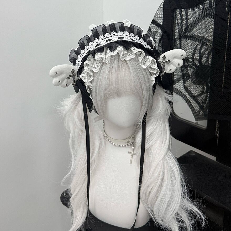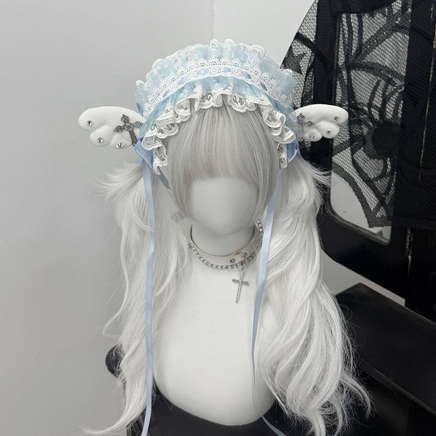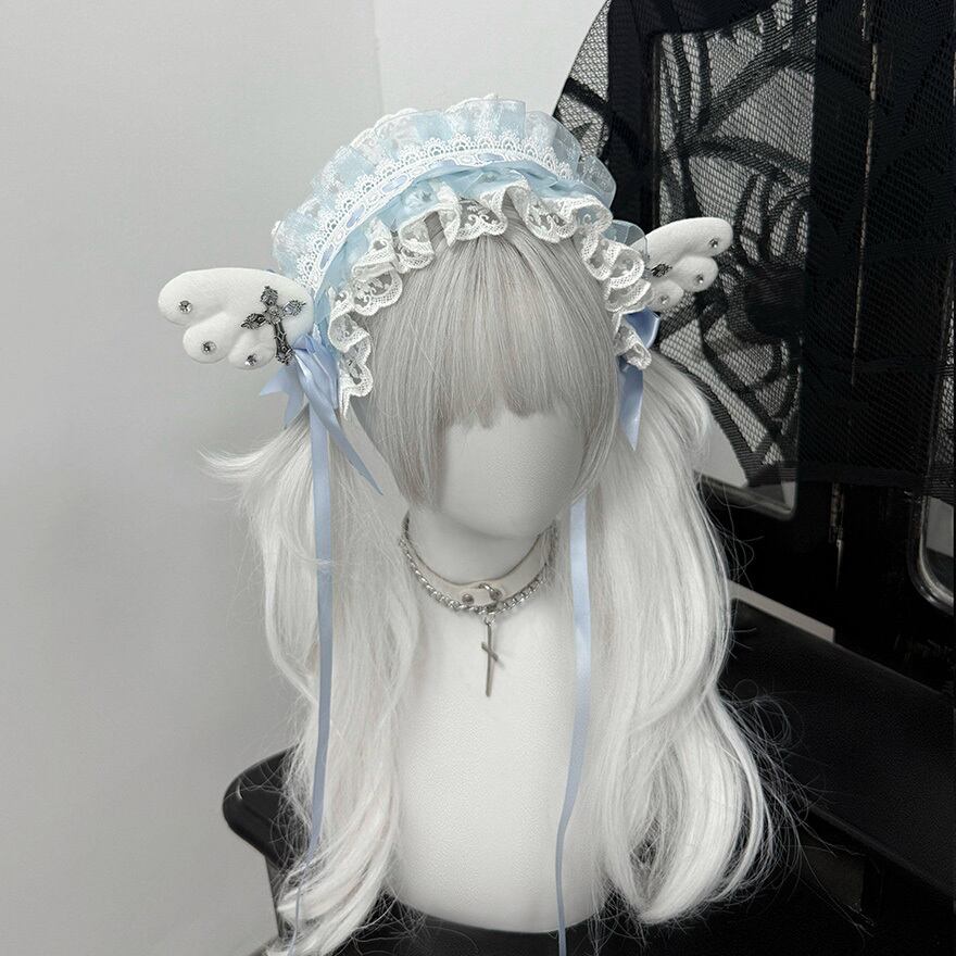 地雷系 ヘッドドレス 天使の羽×十字架チャーム|水色・黒 レースアップ ライブ|SEASONZ