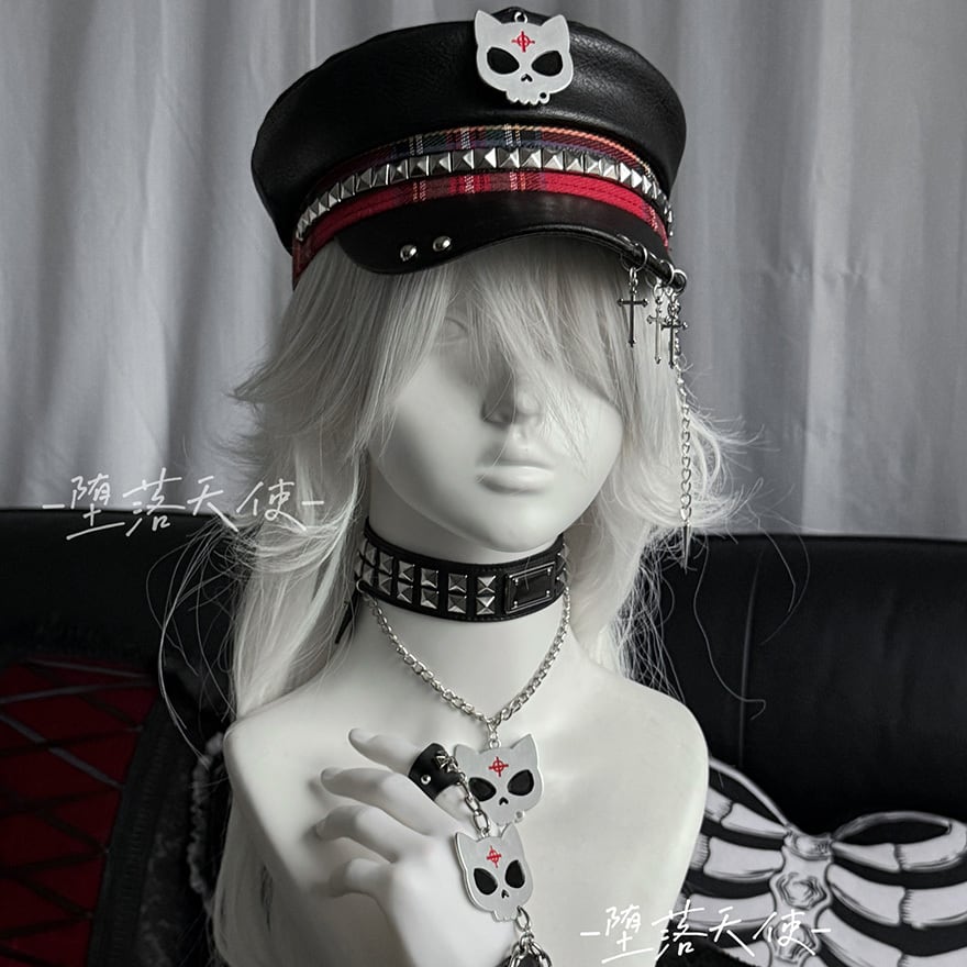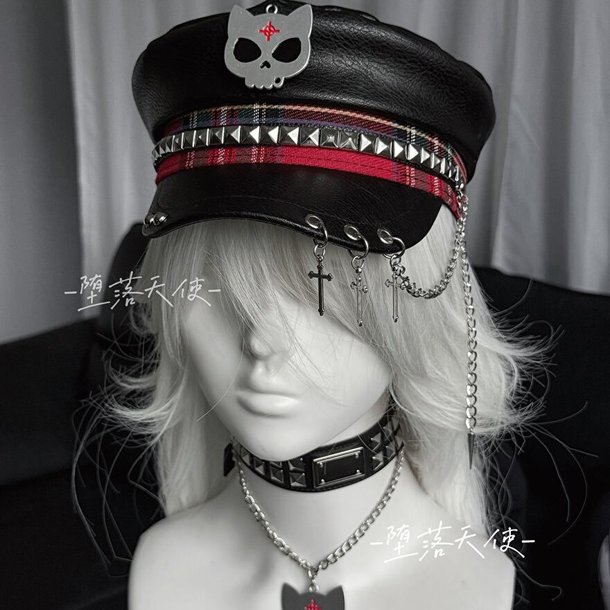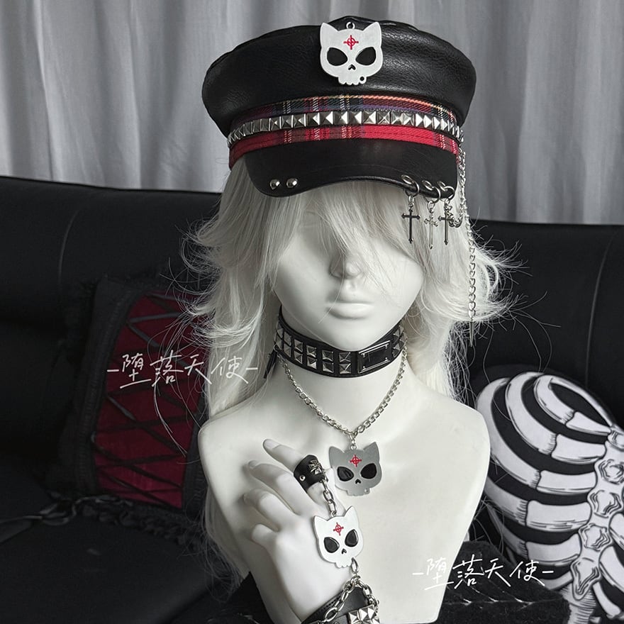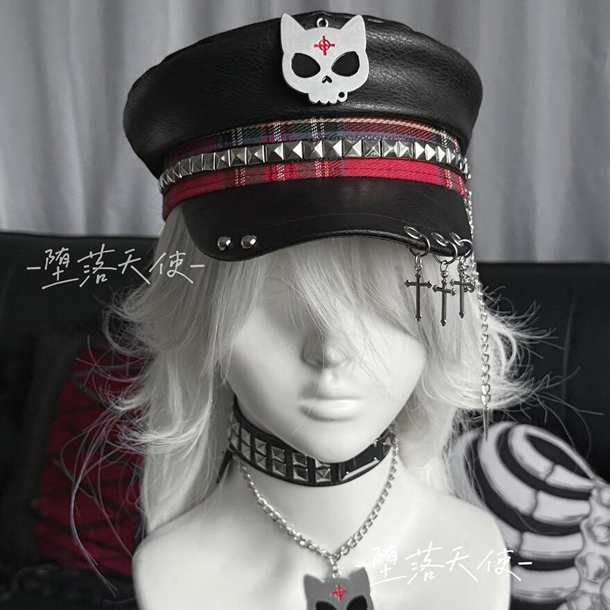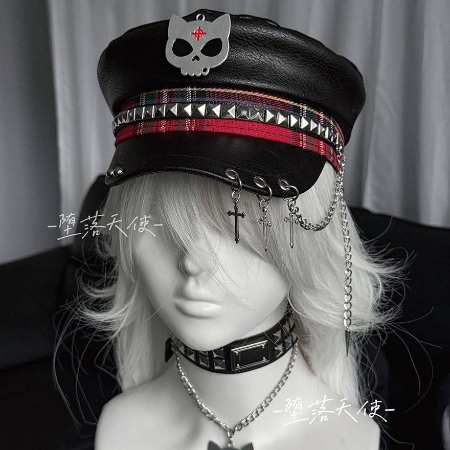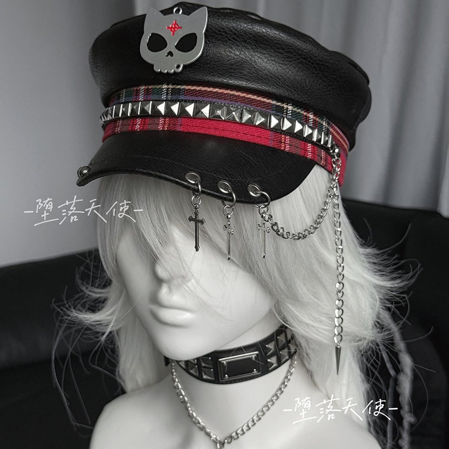 フロントには猫耳風のドクロマーク、サイドにはスタッズと赤のチェック柄テープが配され、バイザー(つば)部分には3連のシルバーリングと十字架・スパイクのチャームが揺れる非常にエッジの効いたデザインです。