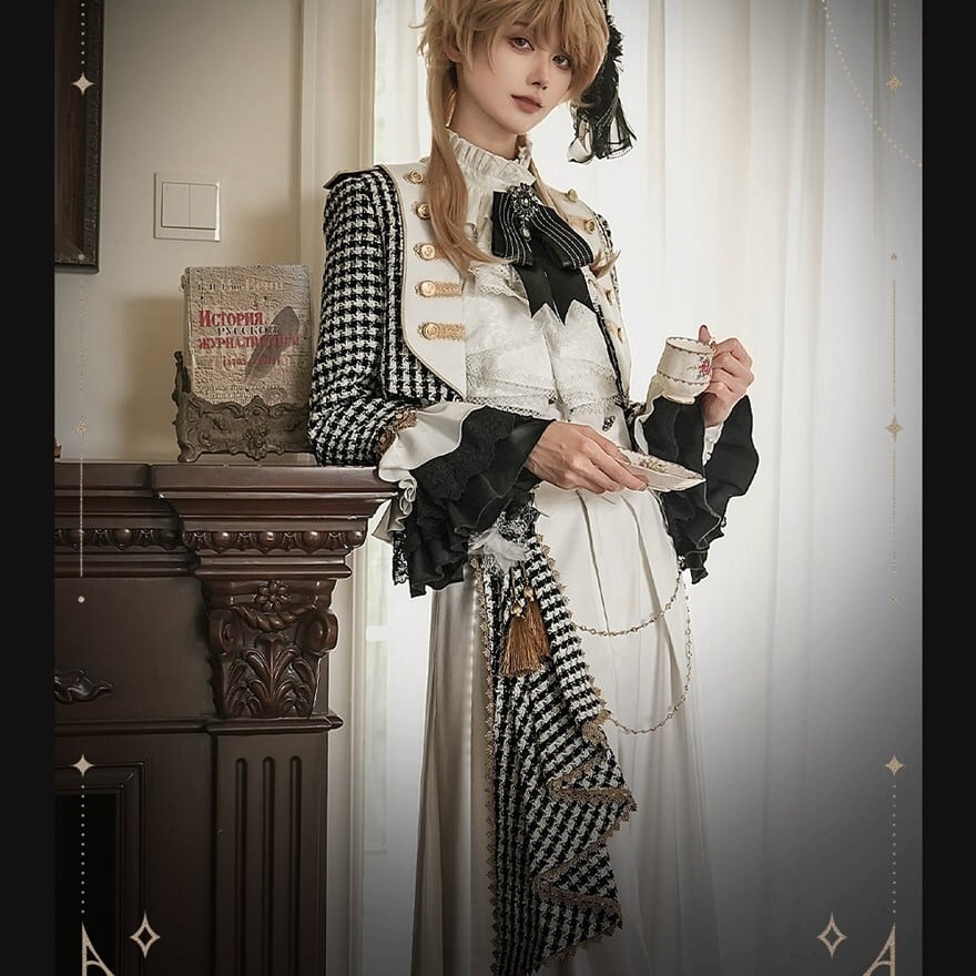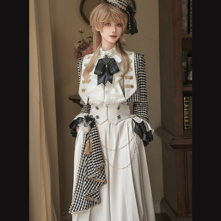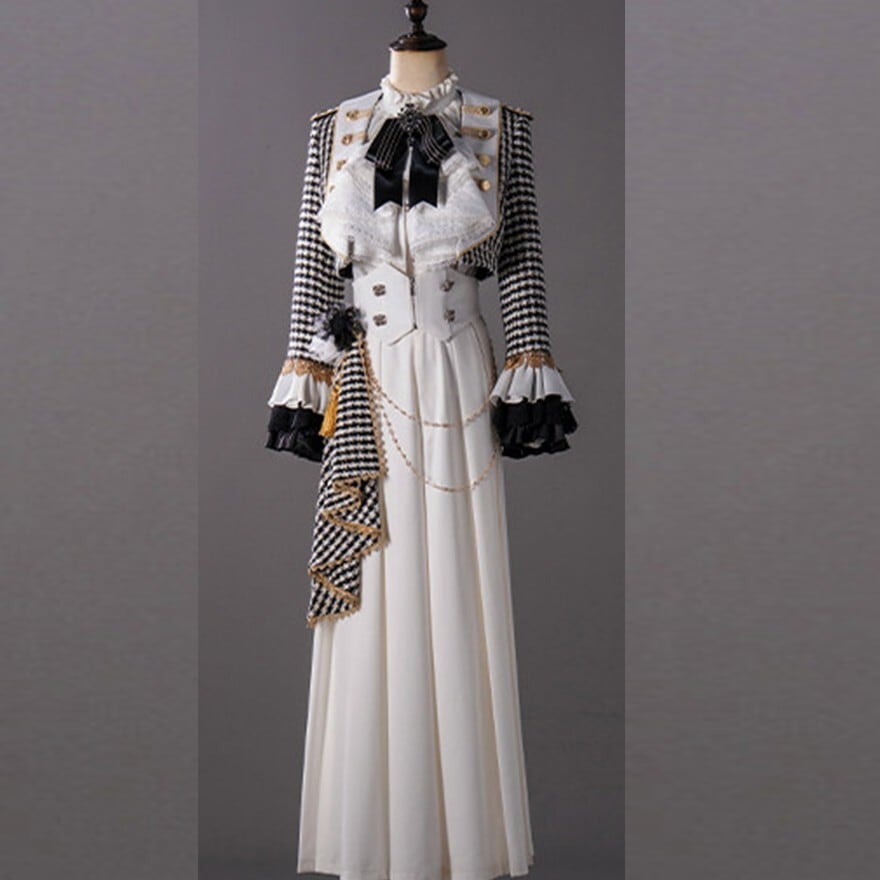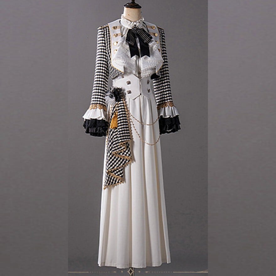 千鳥格子柄アウターとロングパンツを基調に、サイドマント、フリルブラウス、口拭きタオルを組み合わせた王子系プリンス衣装5点セット。ブラック×ホワイトのモノトーン配色にゴールド調ボタンとチェーン装飾を施し、縦長シルエットを強調。格式あるクラシカルスタイルを完成させる構成です。
