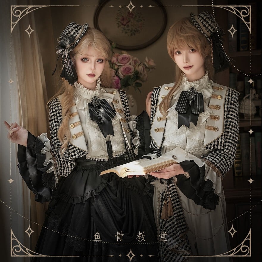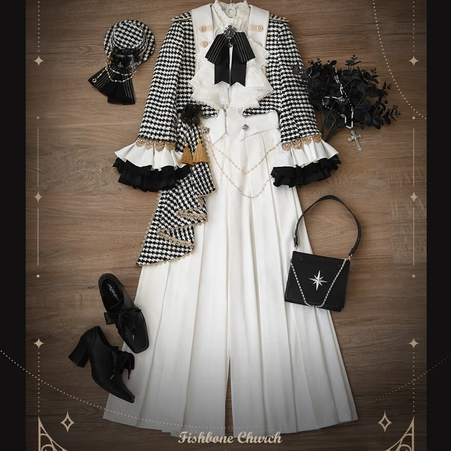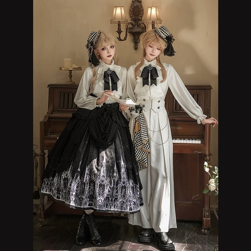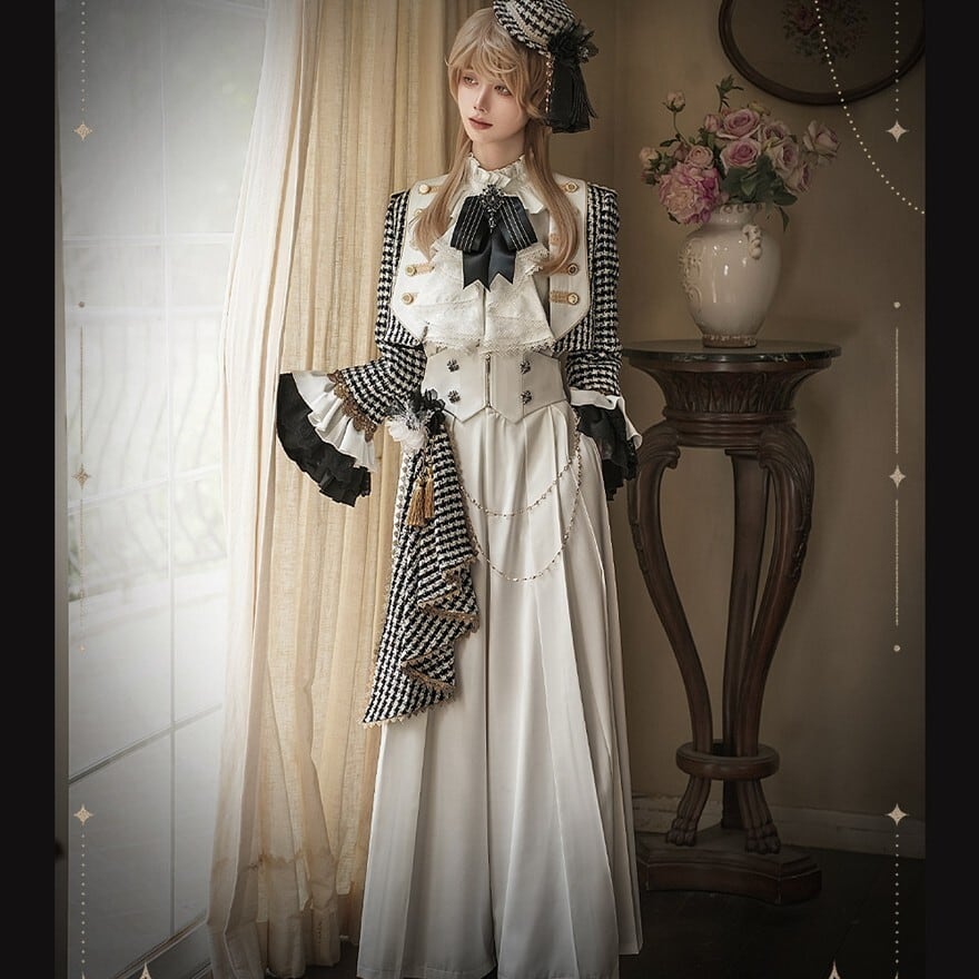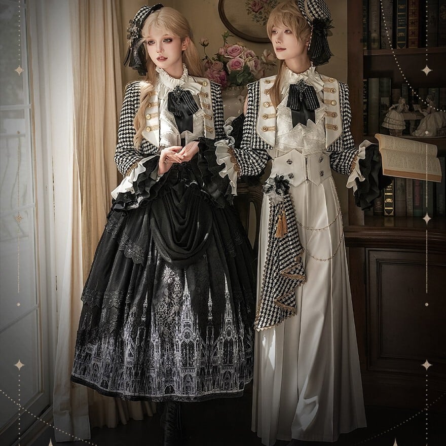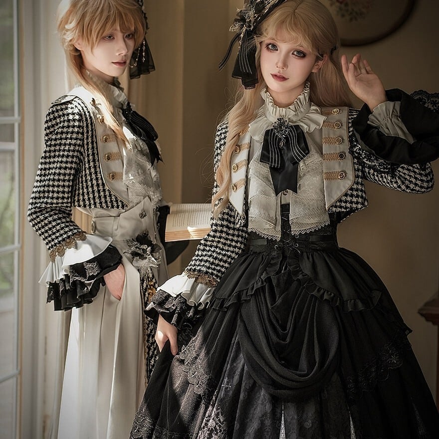 甘ロリの可憐さよりも中性的で格式を重視した王子系デザイン。ゴスロリほどダークカラーに寄らず、クラロリの上品さを基盤にパンツスタイルで構築的な印象を持つ立ち位置。地雷系のカジュアル感とは異なる正統派クラシカル路線。