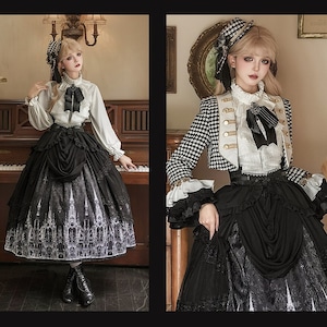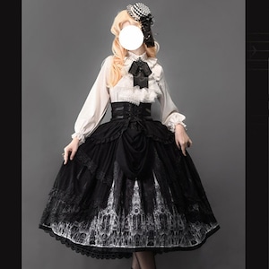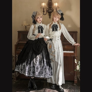 甘ロリよりも装飾を抑えたモノトーン基調で、クラロリの上品さに王子系の構築感を融合。ゴスロリほど暗色一色に寄らず、プリント柄で物語性を加えた中間的ポジション。地雷系のストリート感とは異なる格式重視のデザイン。