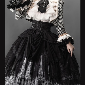 千鳥格子柄アウターとゴシック建築風プリントのSKスカートを組み合わせた王子系プリンセス衣装5点セット。ブラウス、ウエストトレーン、口拭きタオルを含む構成で、ブラック×ホワイトのモノトーンを基調にゴールド調ボタンとチェーン装飾が映えるデザイン。立体感あるシルエットを演出します。