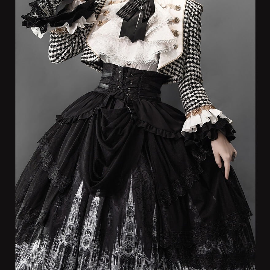 ・ゴシック建築風プリント入りSKスカートで重厚感を表現
