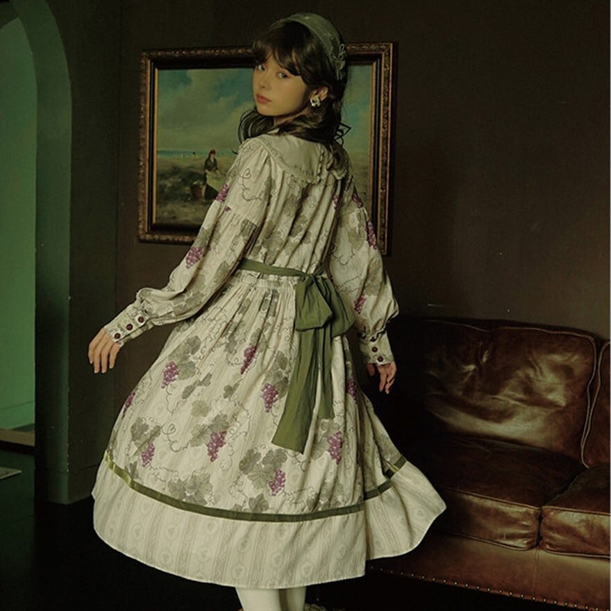 大きめのセーラーカラーと繊細な花柄プリントが印象的なクラシカルロリィタワンピースです。ウエストはリボンで調整可能な仕様。長袖デザインと程よいロング丈で、落ち着きのあるシルエットを演出します。カラーと裾デザイン違いの4タイプ展開です。