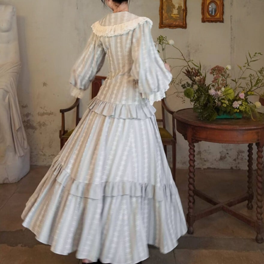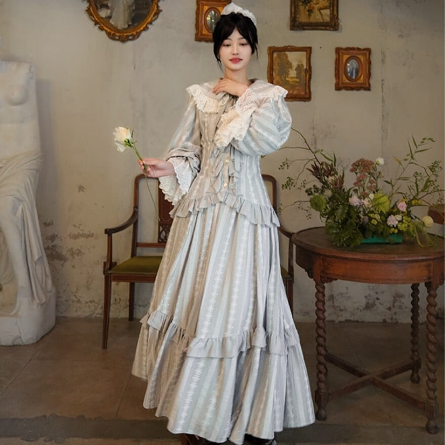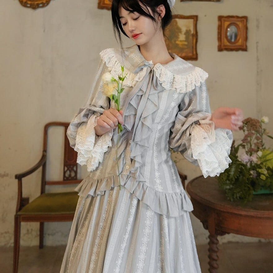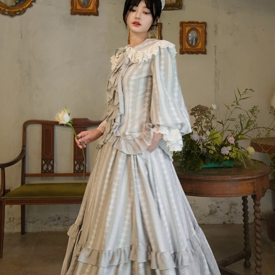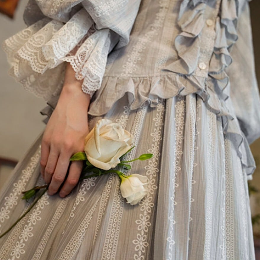 クラシカルロリィタは重たく見えないか不安 → 縦ストライプ調の生地と落ち着いた銀灰色により、全体がすっきりとした印象にまとまります。