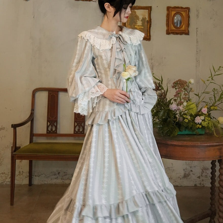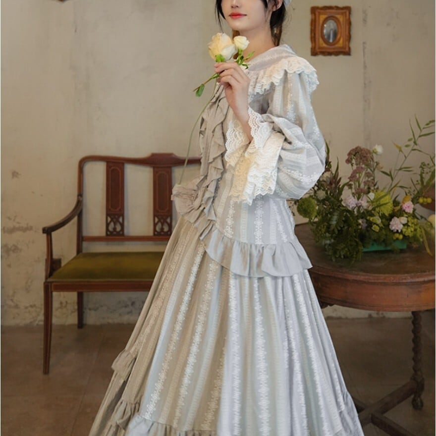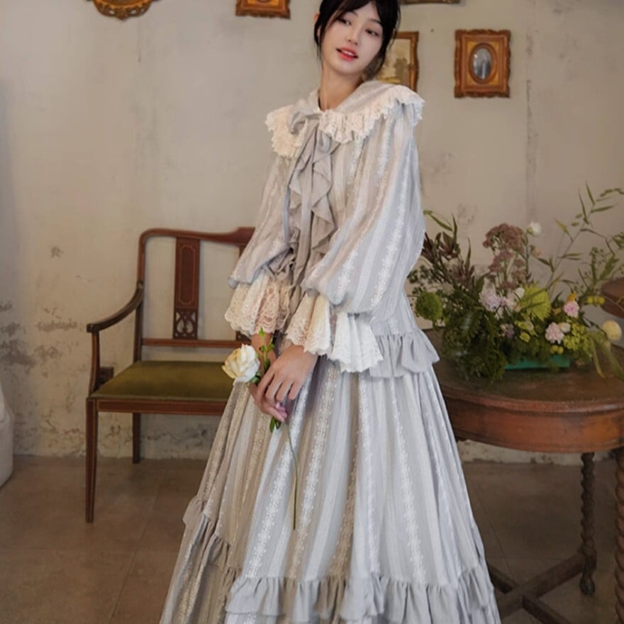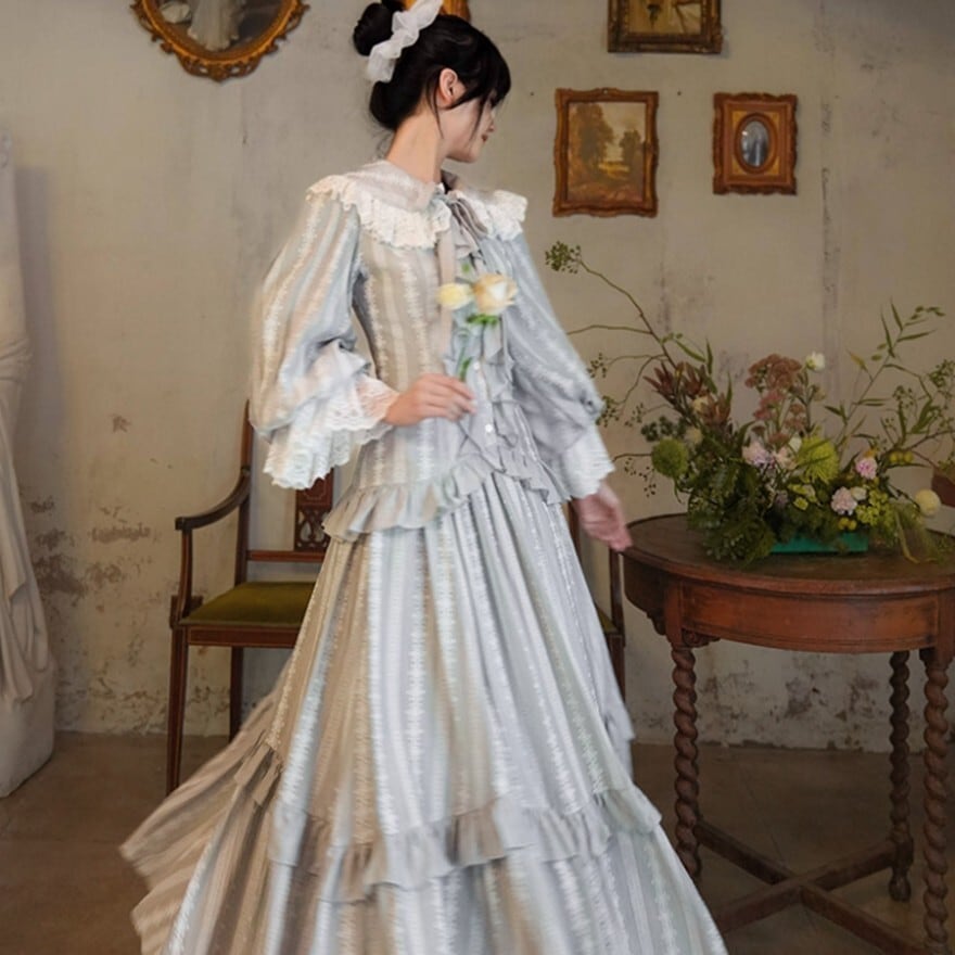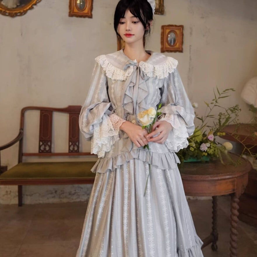 月光のような淡い銀灰色が印象的な、クラシカルロリィタテイストのブラウス+ロングスカートのセットアップ。大きなレース襟と胸元フリル、ウエスト切替の二段フリルが縦のラインを美しく強調します。上品で落ち着いた配色のため、甘さを抑えた優雅な装いを求める方に適した一着です。