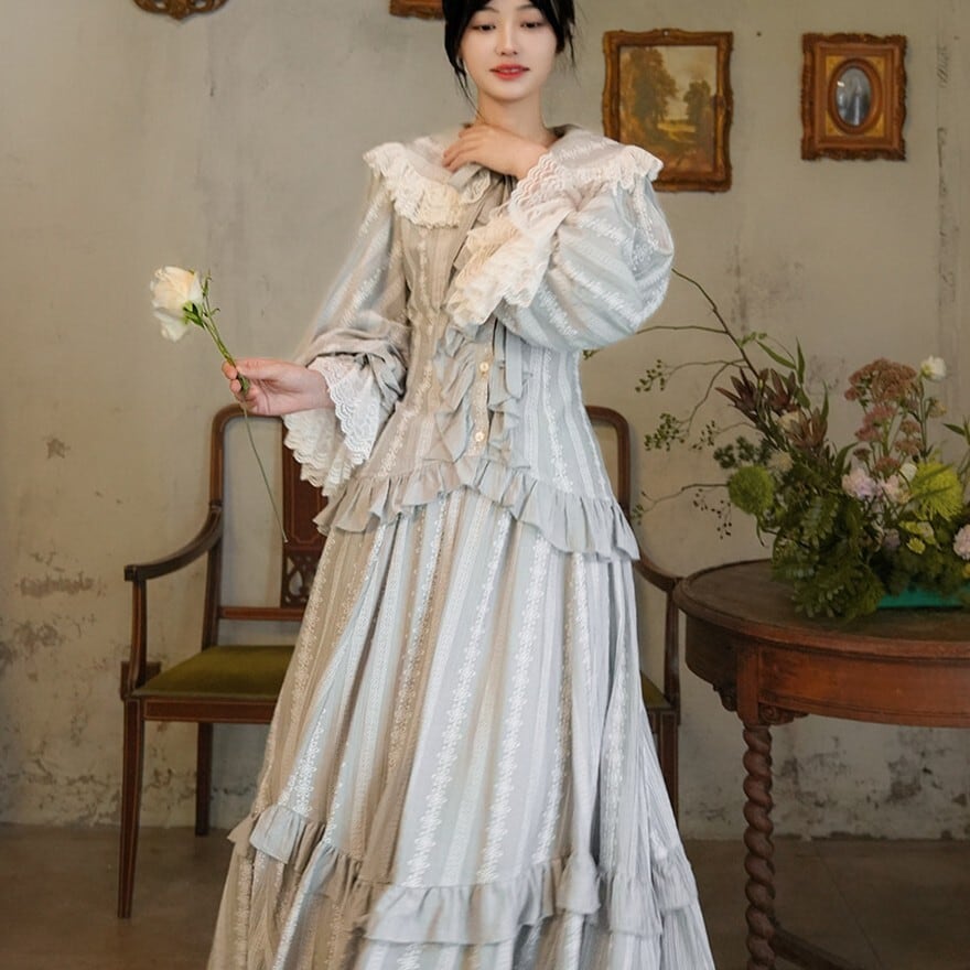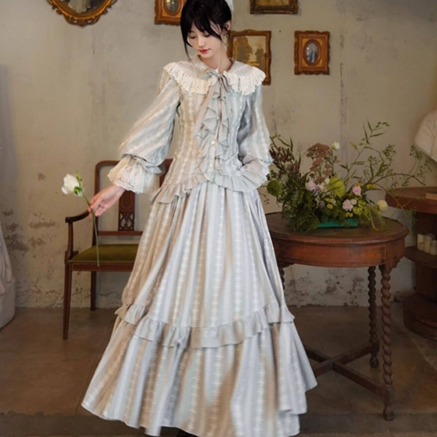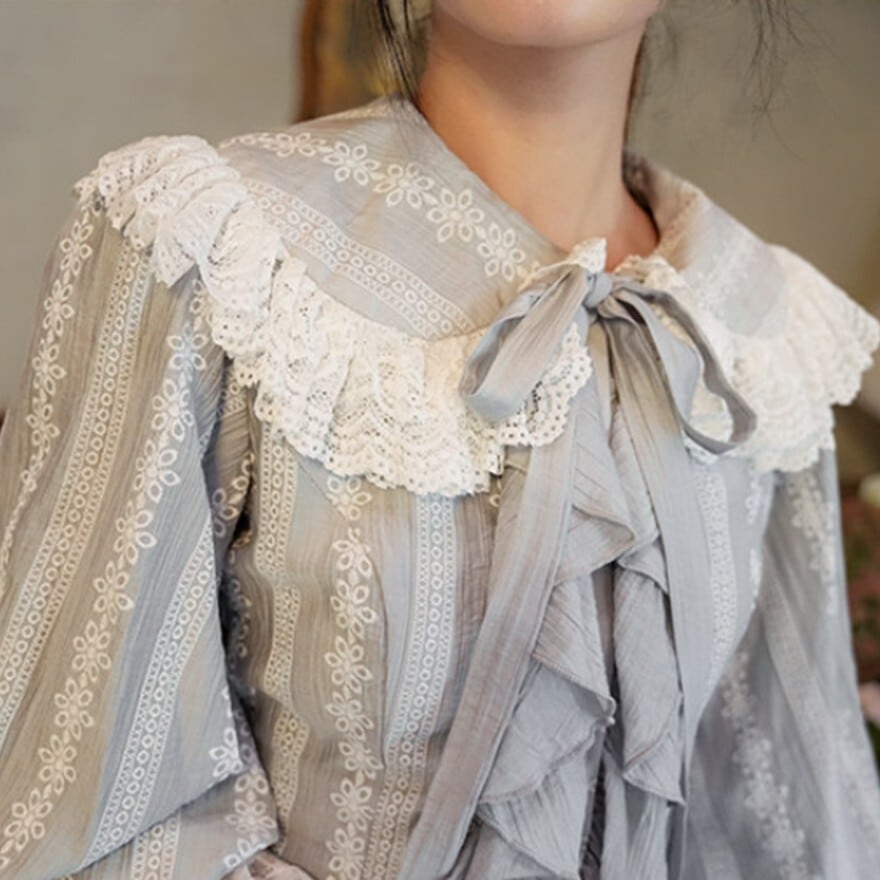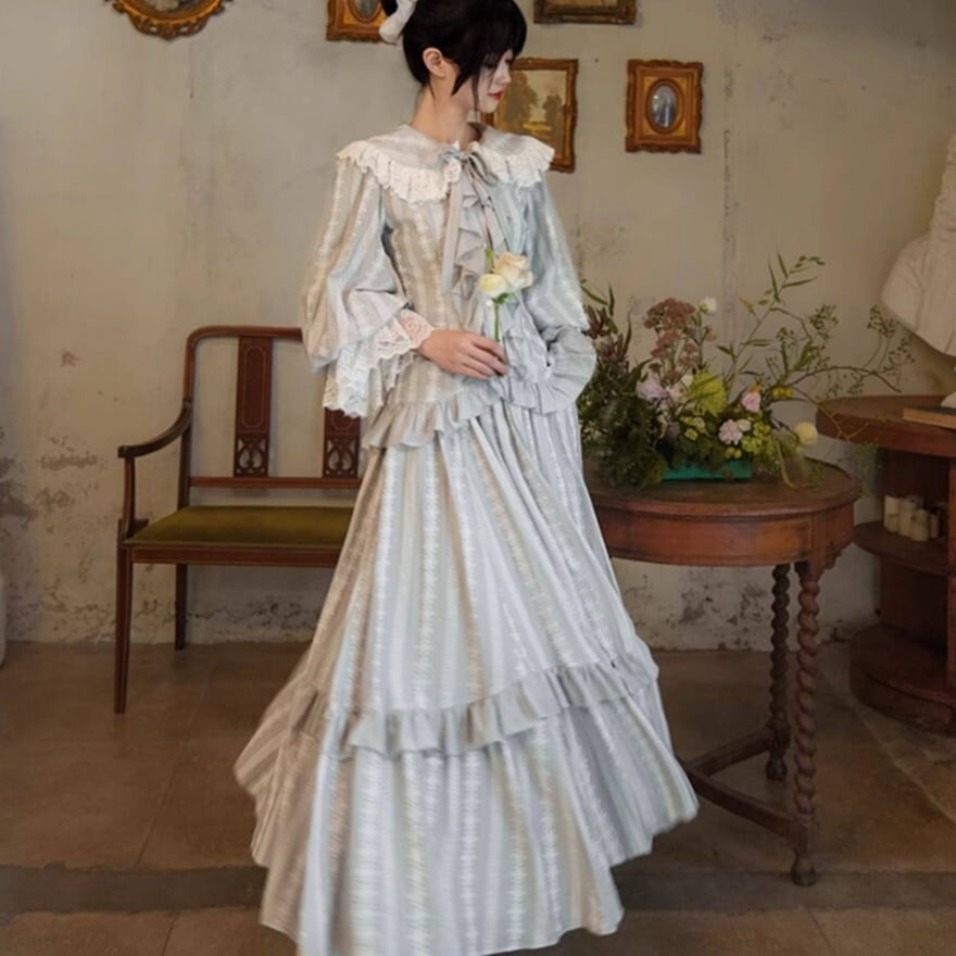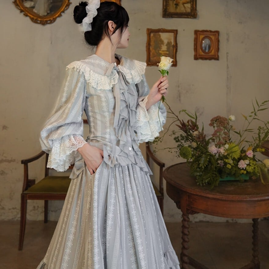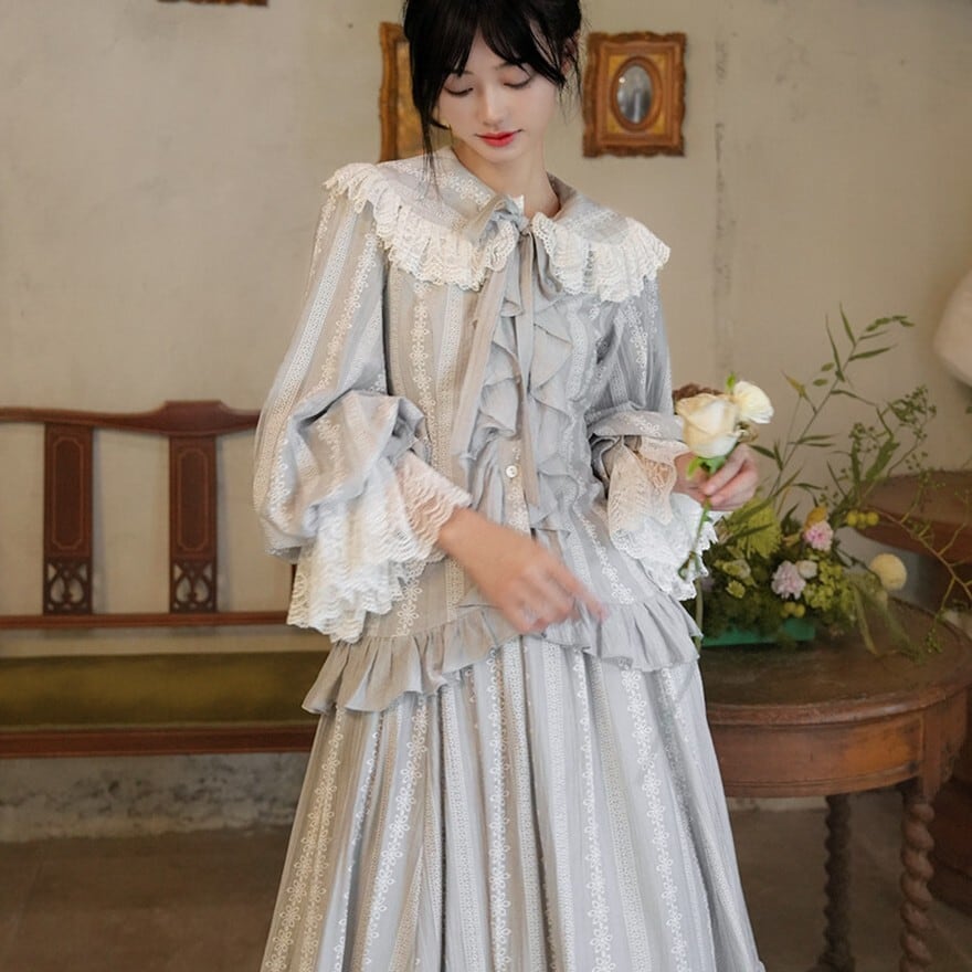 月光のような淡い銀灰色が印象的な、クラシカルロリィタテイストのブラウス+ロングスカートのセットアップ。大きなレース襟と胸元フリル、ウエスト切替の二段フリルが縦のラインを美しく強調します。上品で落ち着いた配色のため、甘さを抑えた優雅な装いを求める方に適した一着です。