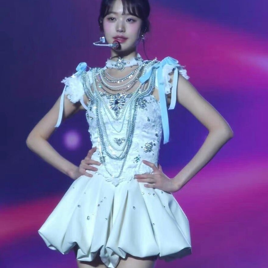 ステージで圧倒的な存在感を放つ、豪華なビジュー装飾が施されたアイドルライブ衣装です。光を反射してキラキラと輝く胸元の装飾と、ふんわりとしたボリューム感のあるミニスカートが、躍動感のあるパフォーマンスを演出します。ライブイベントやダンス衣装、コンカフェの特別なステージ衣装としても最適です。