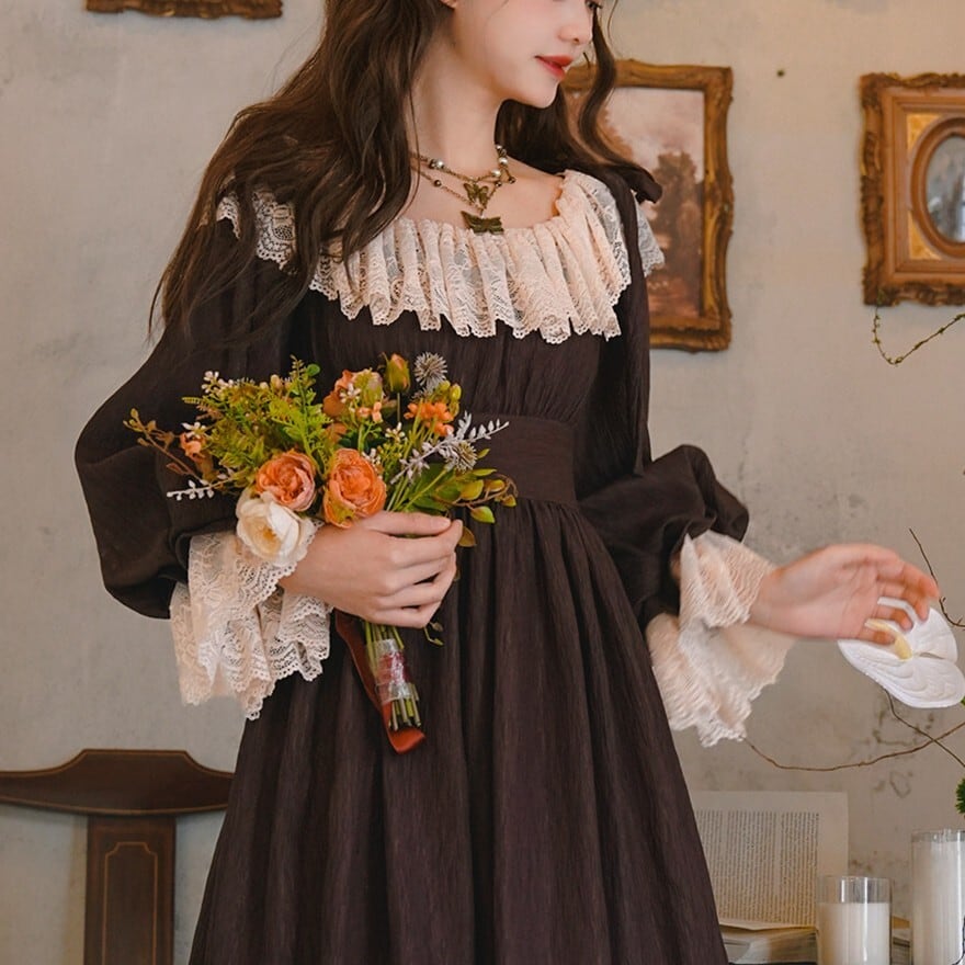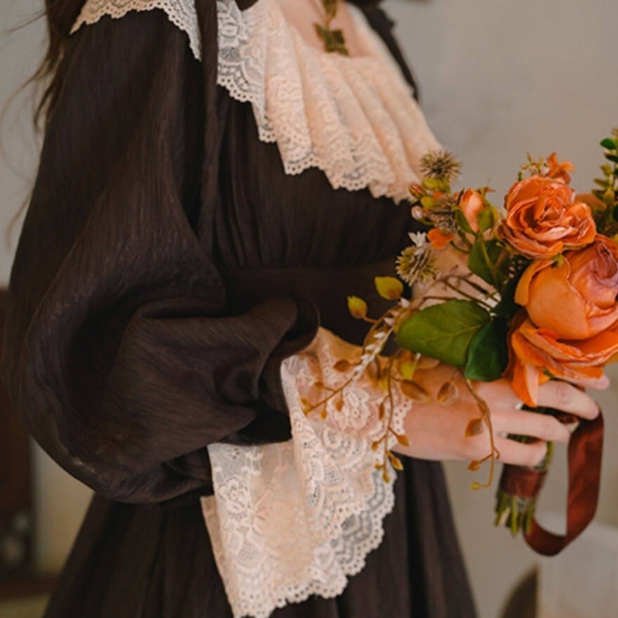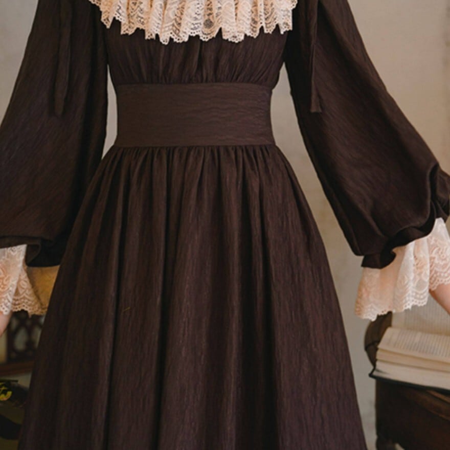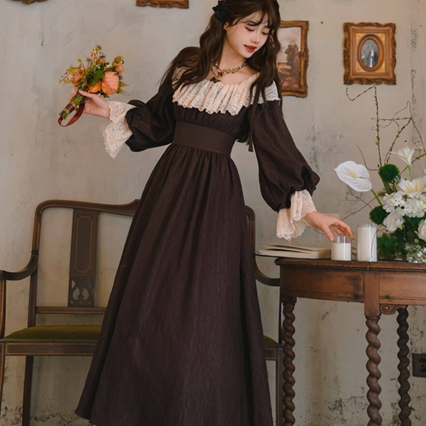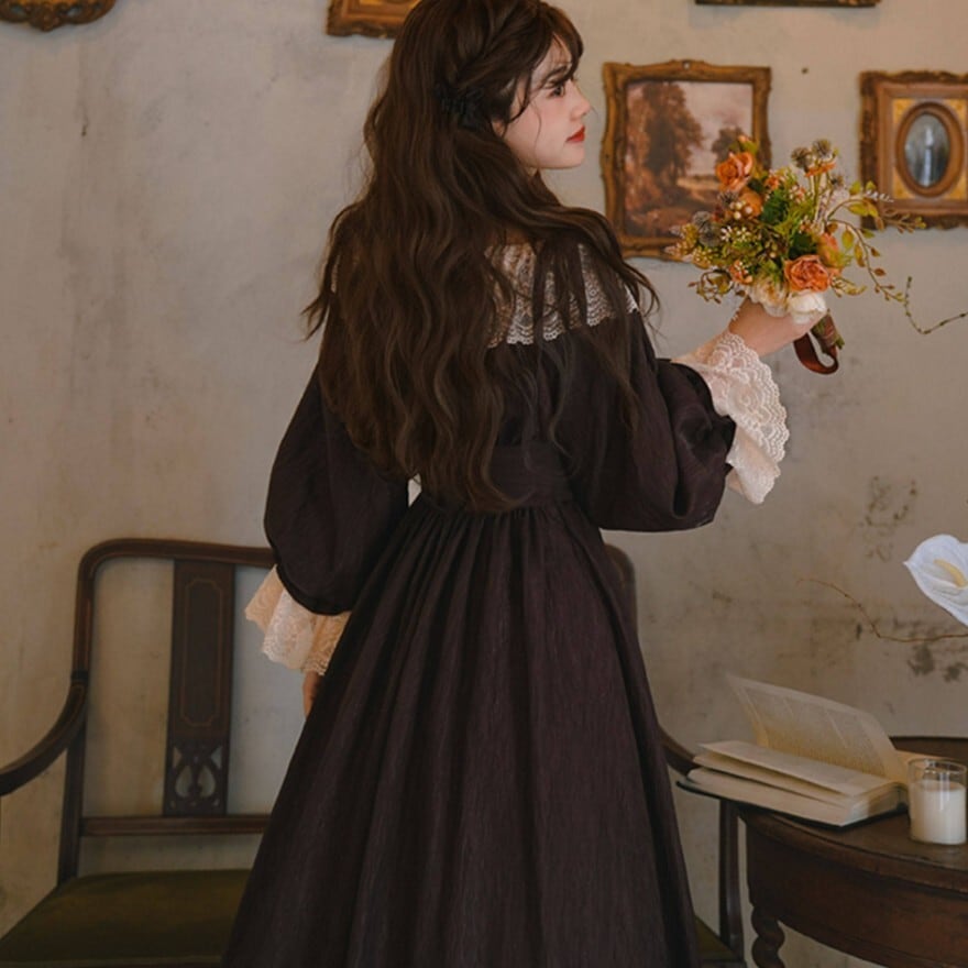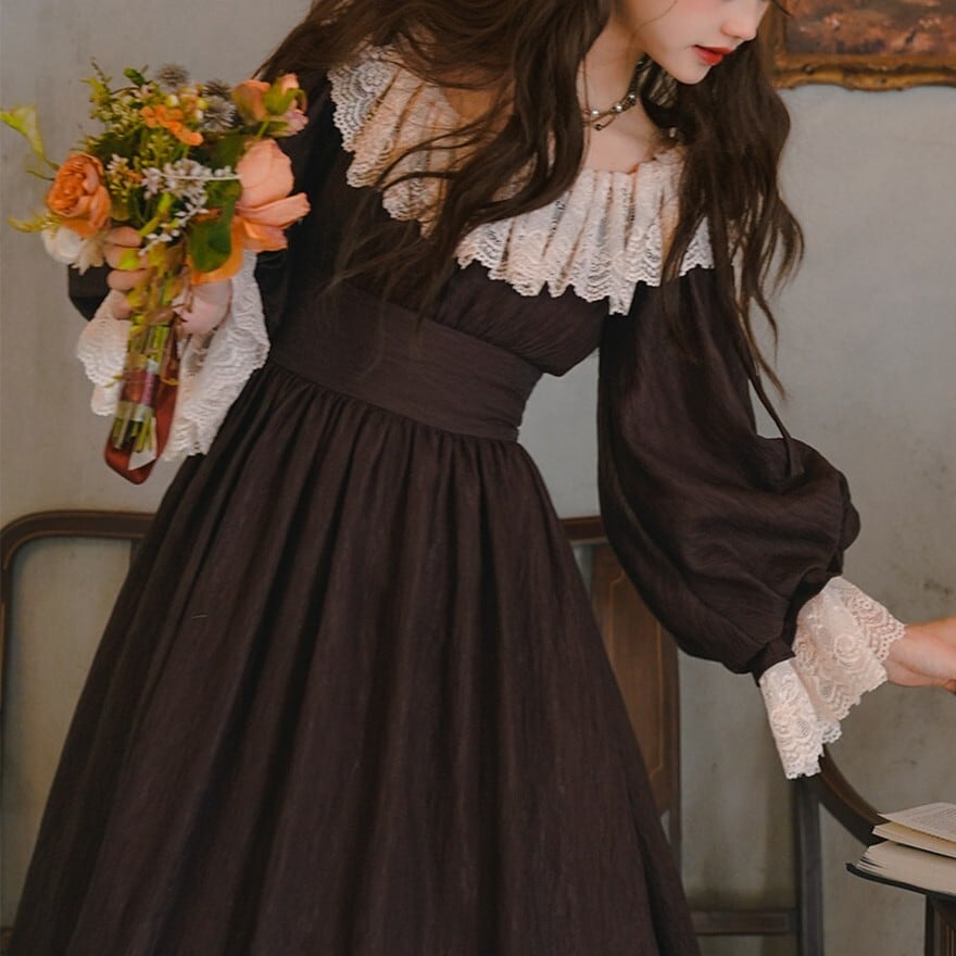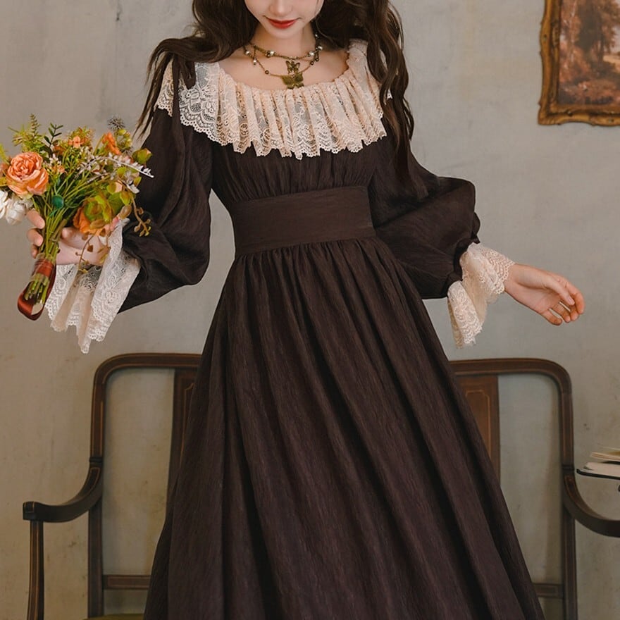 落ち着いたダークブラウンのジャカード織り生地を使用した、フレンチテイストのロングワンピース。広めに開いたネックラインにレースフリルをあしらい、ボリュームのあるランタンスリーブとレースカフスが柔らかな印象を演出します。ウエスト切替から広がるAラインシルエットが縦のラインを整える一着です。