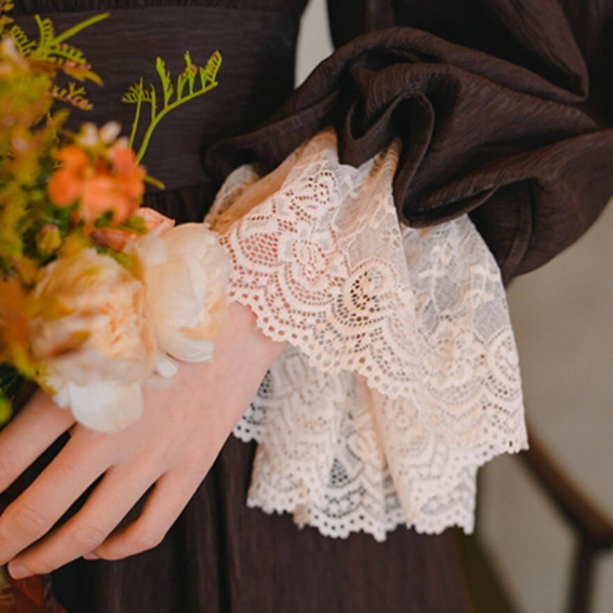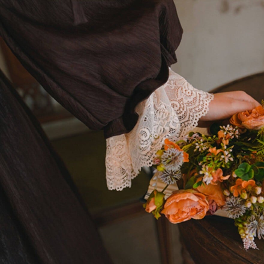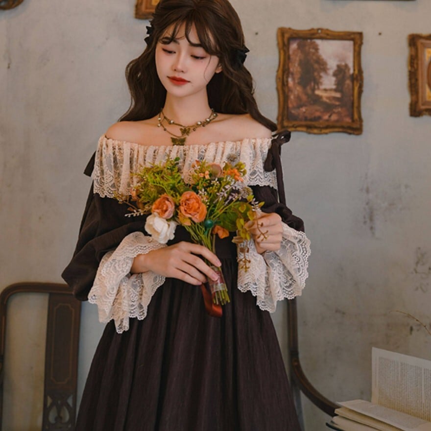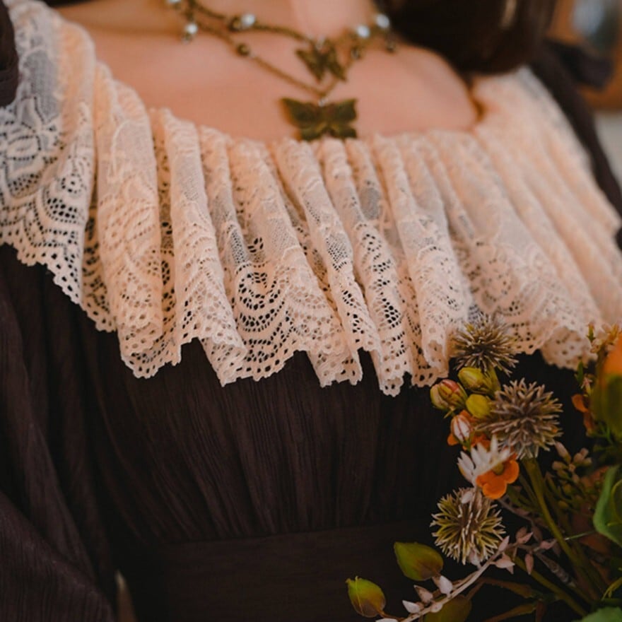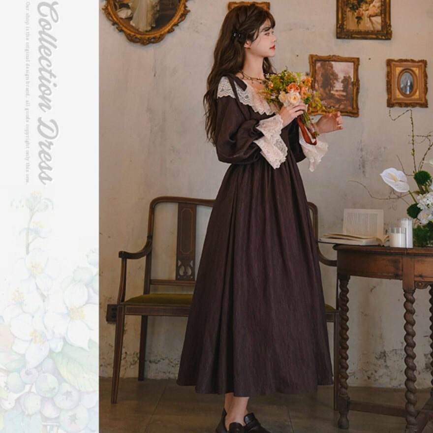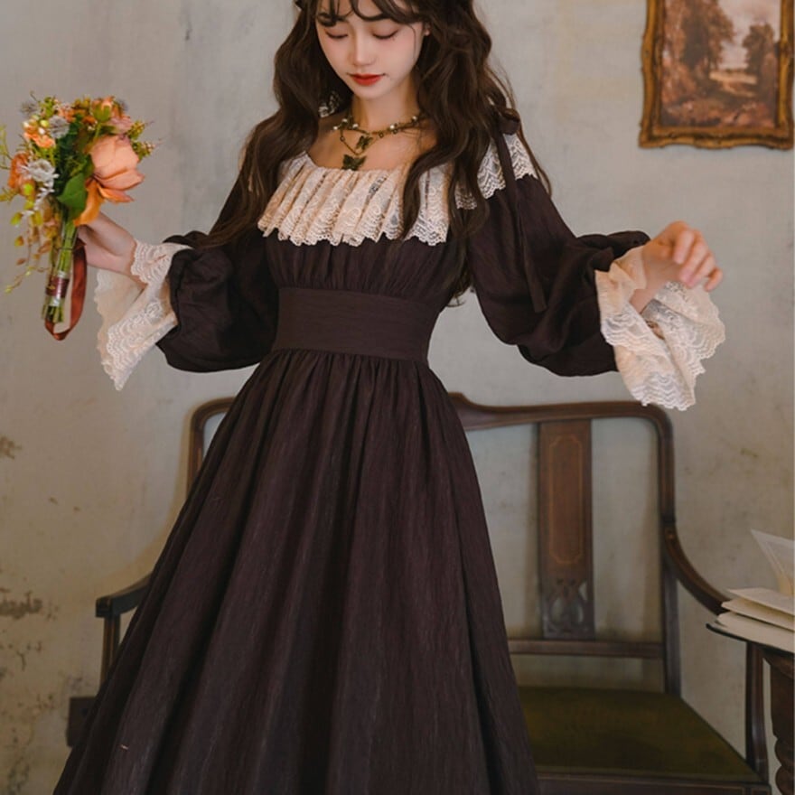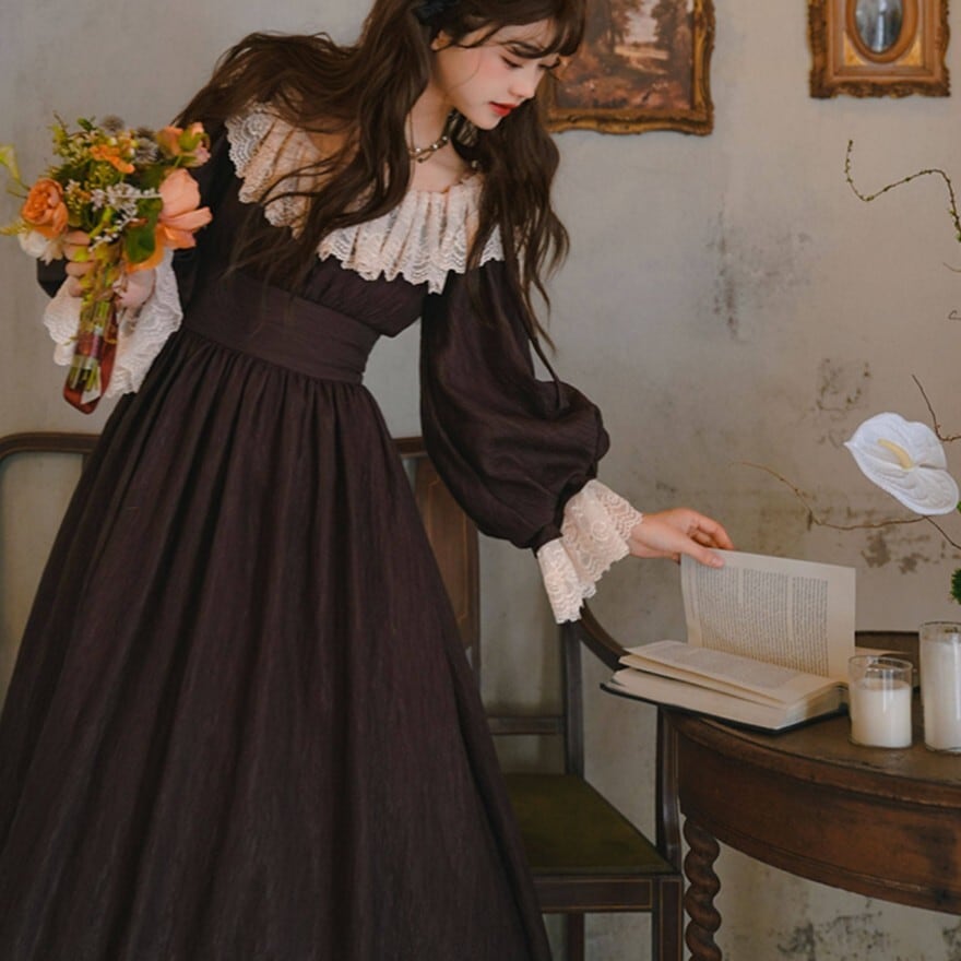 落ち着いたダークブラウンのジャカード織り生地を使用した、フレンチテイストのロングワンピース。広めに開いたネックラインにレースフリルをあしらい、ボリュームのあるランタンスリーブとレースカフスが柔らかな印象を演出します。ウエスト切替から広がるAラインシルエットが縦のラインを整える一着です。