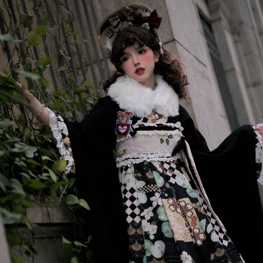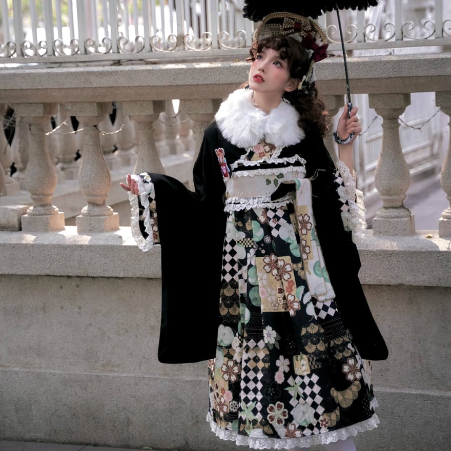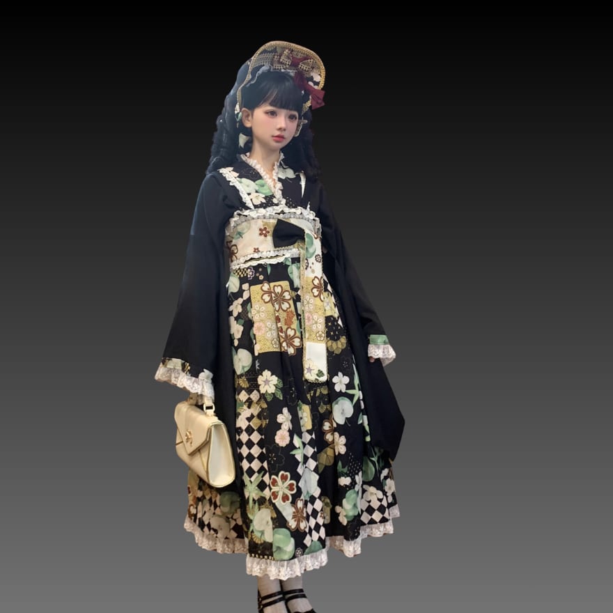 国内即日発送|大正浪漫 和ロリィタ 振袖ジャンパースカート&カチューシャ 2点セット (ブラック花柄)卒業式・入学式対応 和装ロリータ