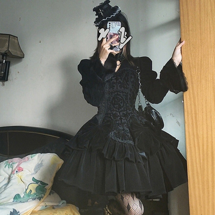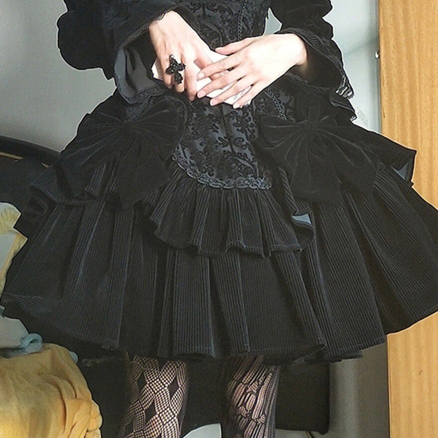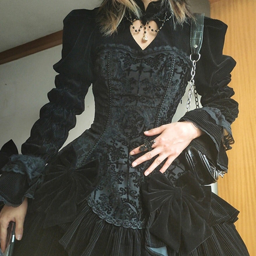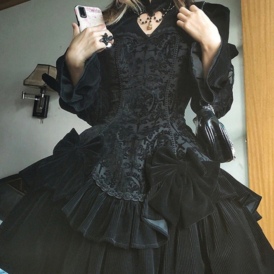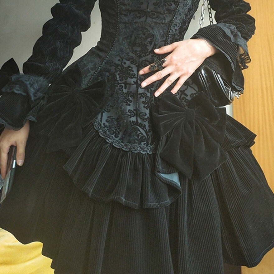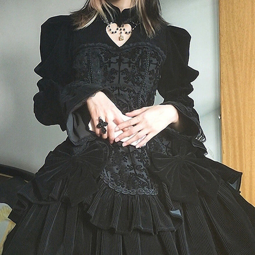 ブラック単色で統一されたゴスロリ仕様の長袖ワンピース。身頃はジャカード調の織り柄生地で切替えられ、ウエストから広がる多段フリルと大ぶりリボンが立体的なシルエットを形成。肩はややパフ仕様、袖口は広がりのあるデザインで、クラシカルかつ重厚感のある印象に仕上げられている。