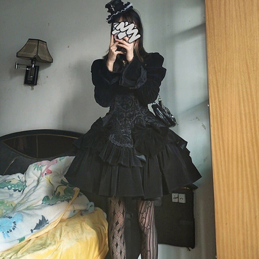 甘ロリの淡色装飾とは異なり、黒基調で統一されたゴスロリ寄りデザイン。クラロリよりも装飾量が多く、地雷系よりもクラシカルで構築的。王子系のパンツスタイルではなく、スカート中心の王道ゴシックロリィタに位置付けられる。
