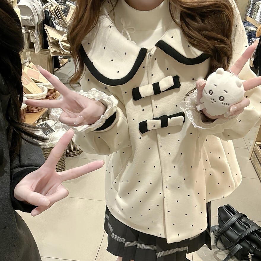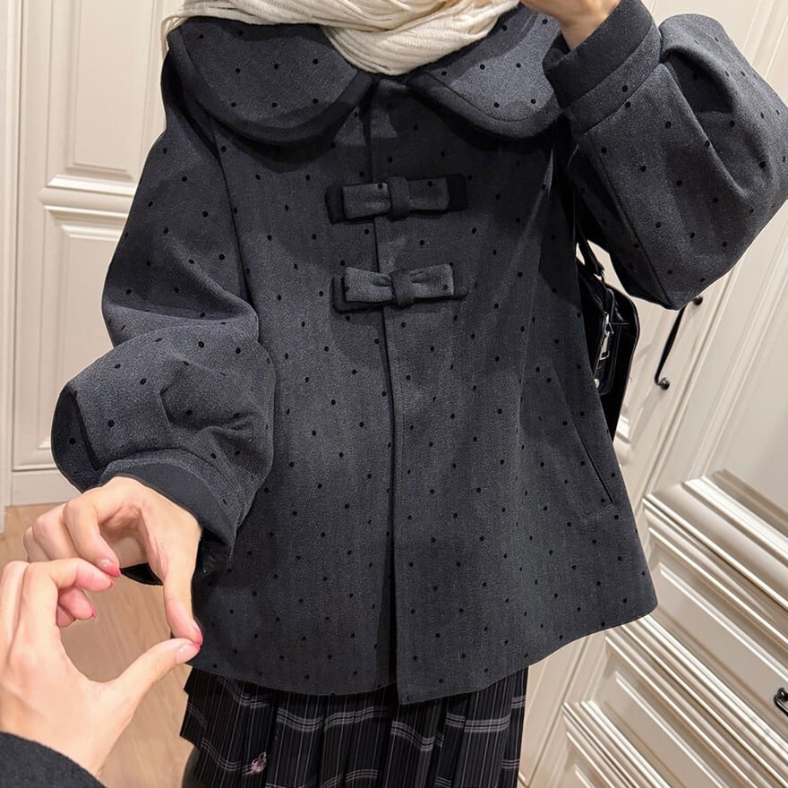 ・大きめ丸襟デザイン、フロントのリボン装飾、全体に施された小粒ドット柄が特徴