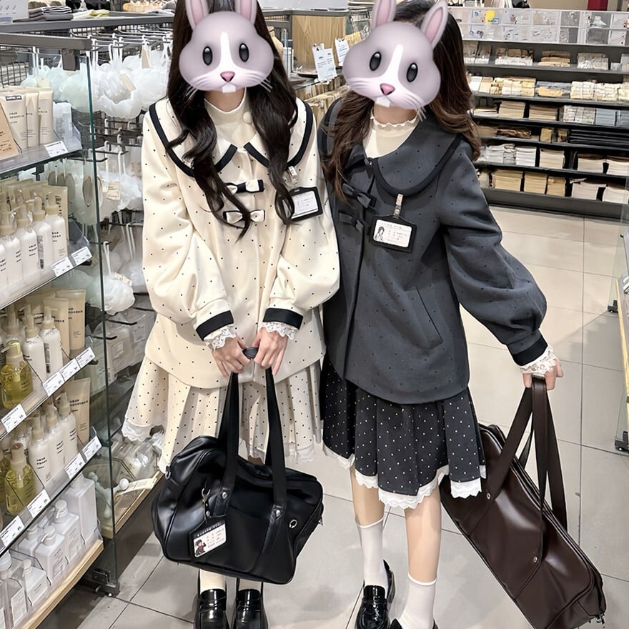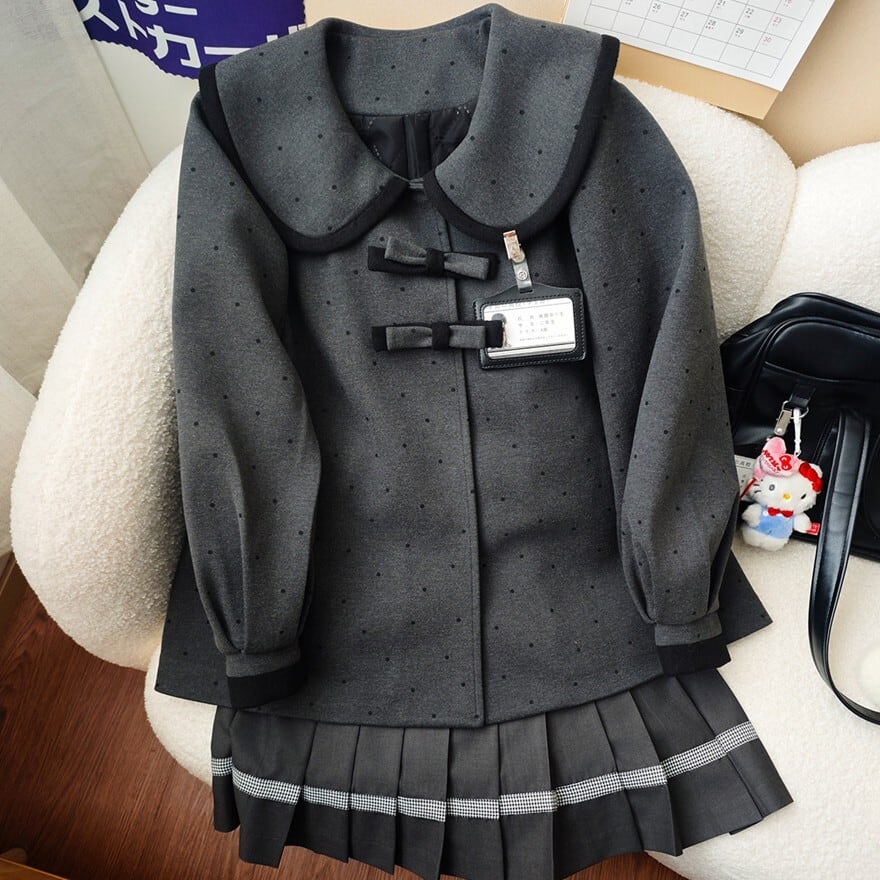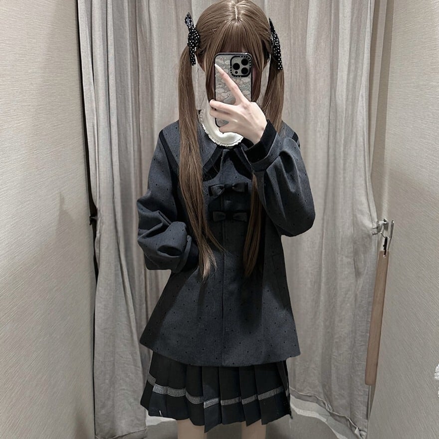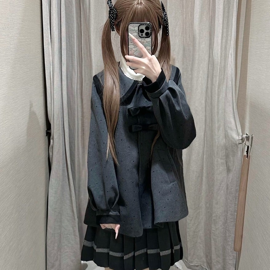 大きめの丸襟とリボン装飾が印象的なクラロリテイストのJK制服風セットアップ。細かなドット柄ジャケットに、裾ライン入りプリーツスカートを合わせた上品で落ち着いた印象の上下セットです。通学風コーデやきちんと感のあるデイリー装いにも取り入れやすいデザインです。