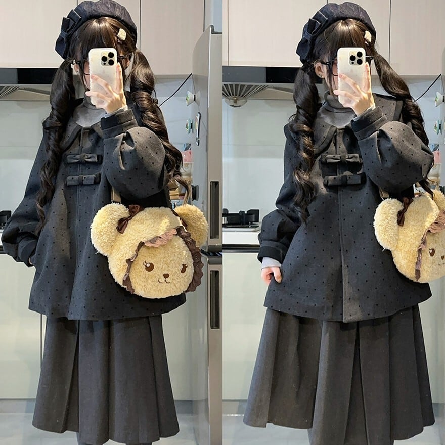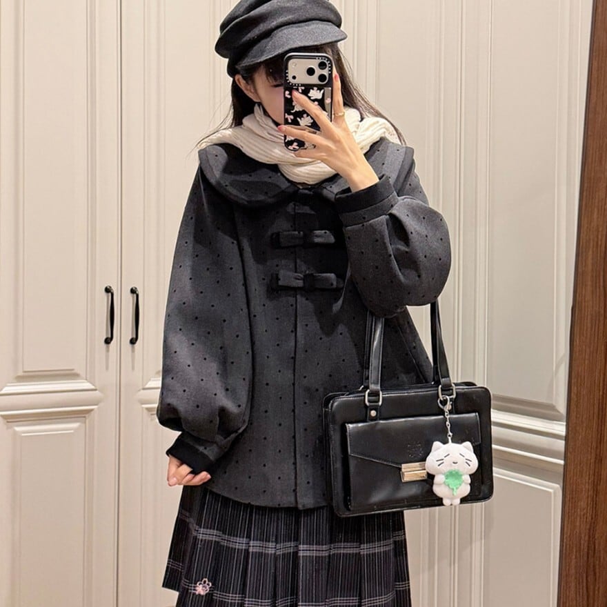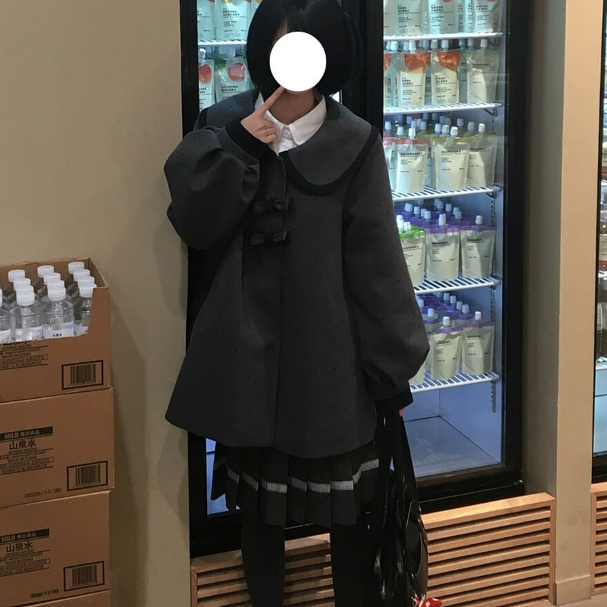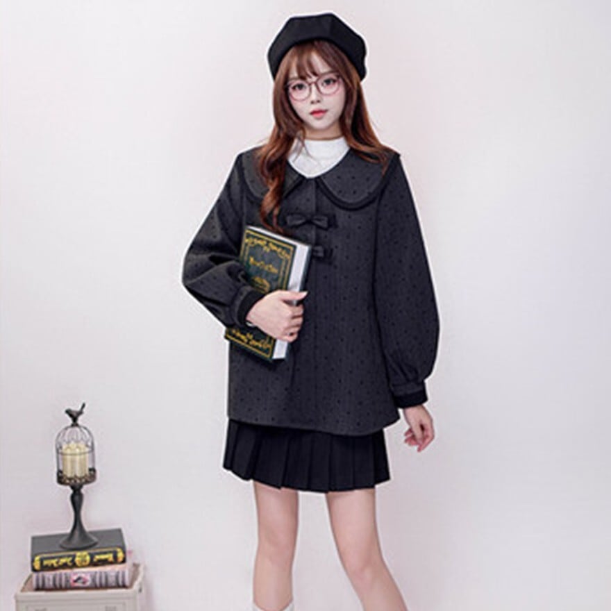 大きめの丸襟とリボン装飾が印象的なクラロリテイストのJK制服風セットアップ。細かなドット柄ジャケットに、裾ライン入りプリーツスカートを合わせた上品で落ち着いた印象の上下セットです。通学風コーデやきちんと感のあるデイリー装いにも取り入れやすいデザインです。