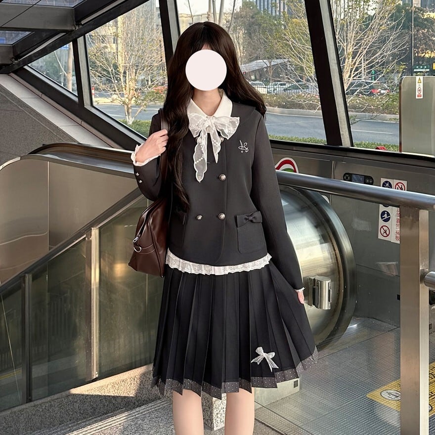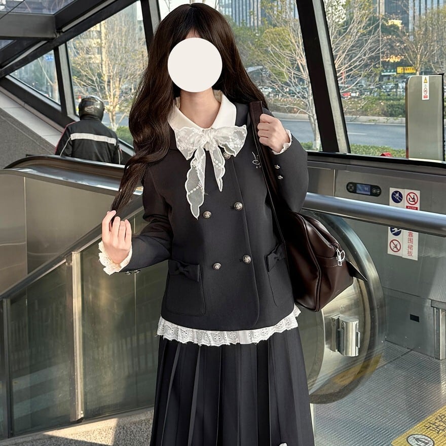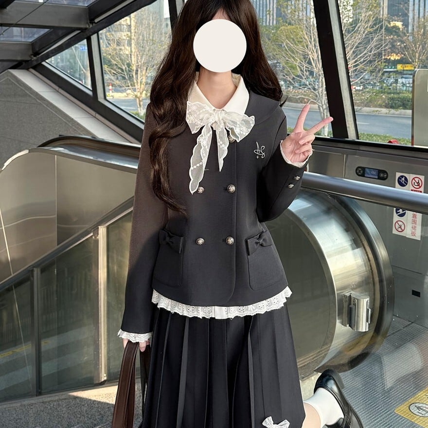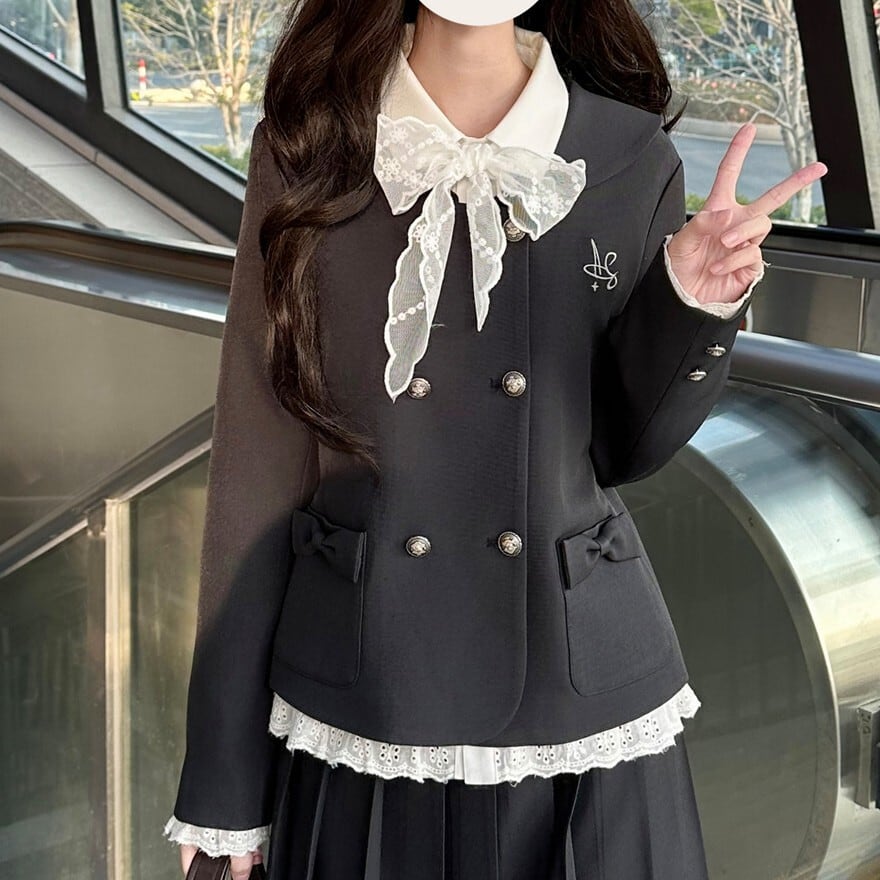 クラシカルロリータの上品さを取り入れたJK風セットアップです。ダブルボタンのコンパクトジャケットと、裾リボン付きプリーツスカートの2点構成。フロントのフリルレースと大きなリボンが清楚な印象を演出し、甘さを抑えたクラロリスタイルを完成させます。