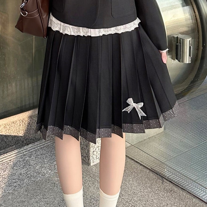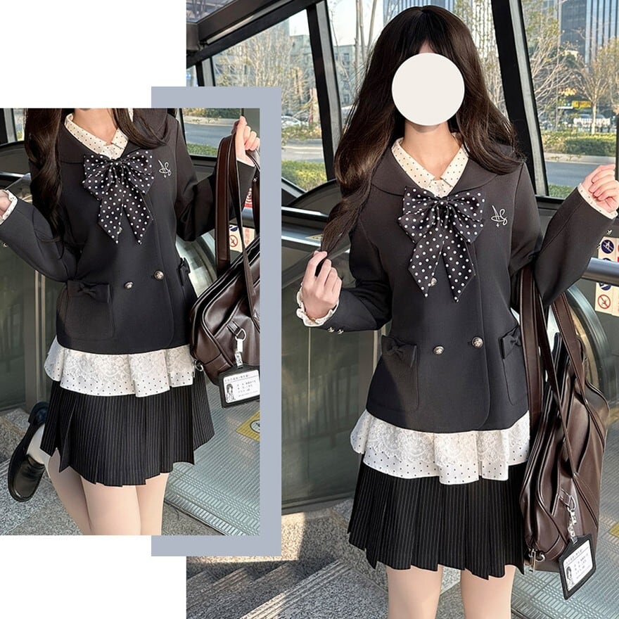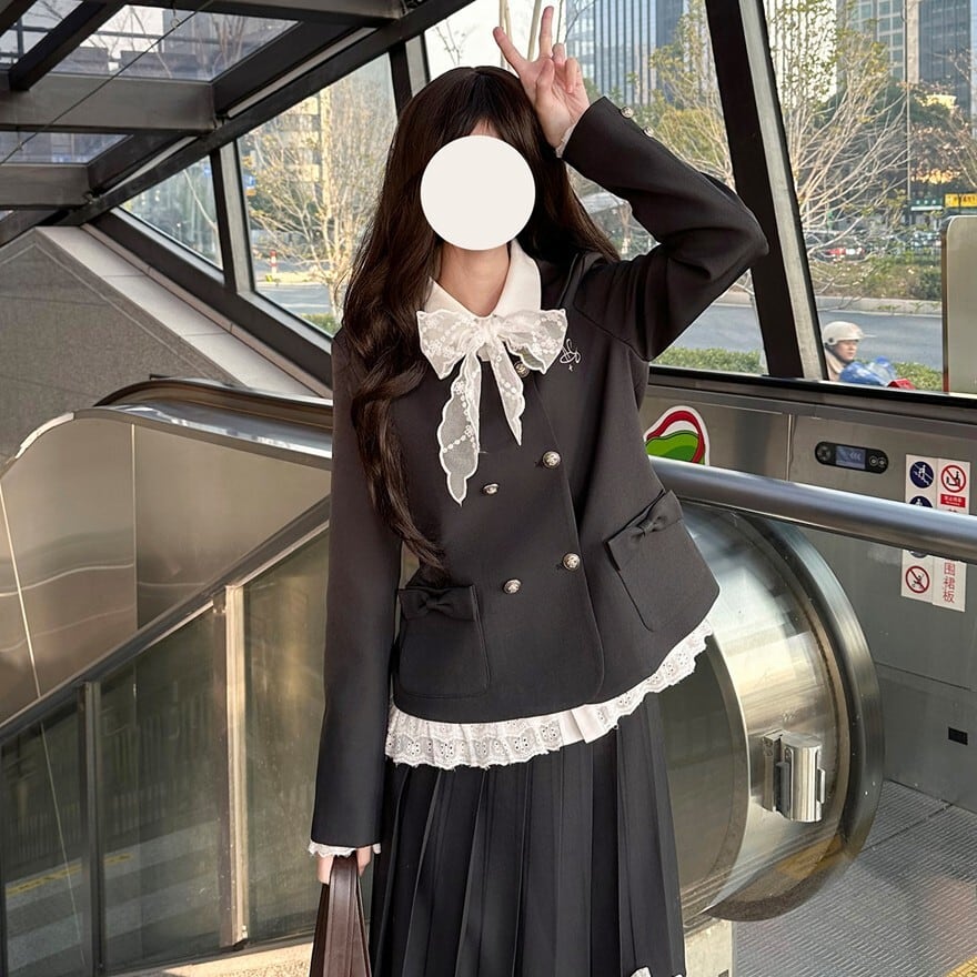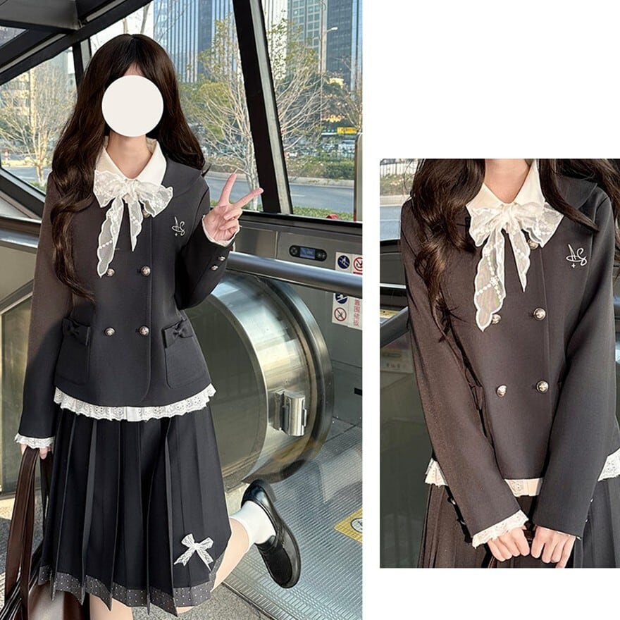 クラシカルロリータの上品さを取り入れたJK風セットアップです。ダブルボタンのコンパクトジャケットと、裾リボン付きプリーツスカートの2点構成。フロントのフリルレースと大きなリボンが清楚な印象を演出し、甘さを抑えたクラロリスタイルを完成させます。
