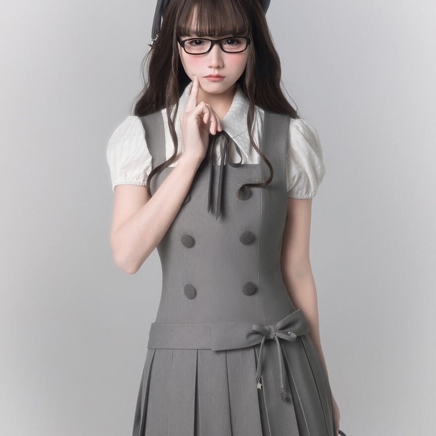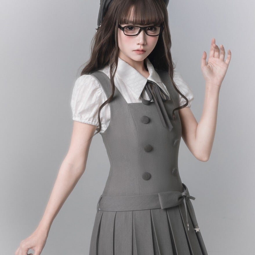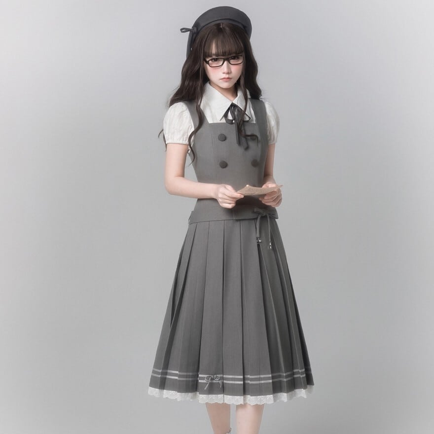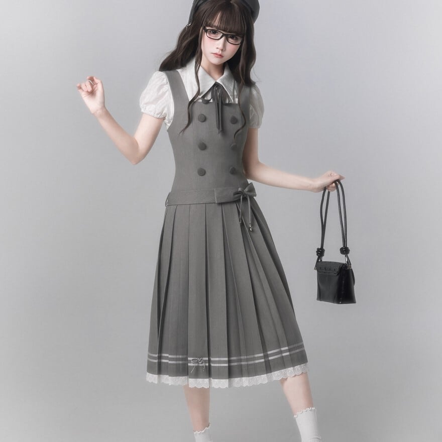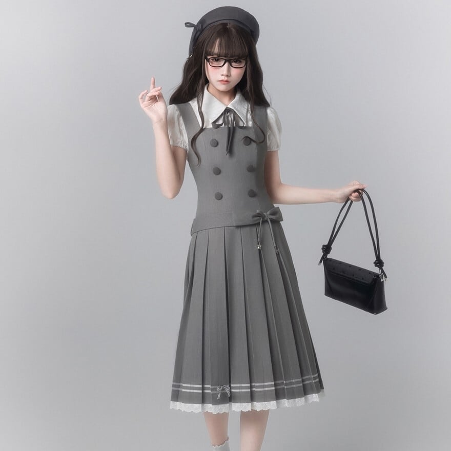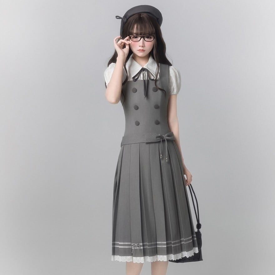グレーカラーで統一されたお嬢様学園風のクラロリセットアップ3点セットです。半袖ブラウス、ダブルボタン仕様のジャンパースカート、ネックリボンを組み合わせた上品な構成。膝下丈プリーツと裾レースが落ち着きと清楚感を演出します。
