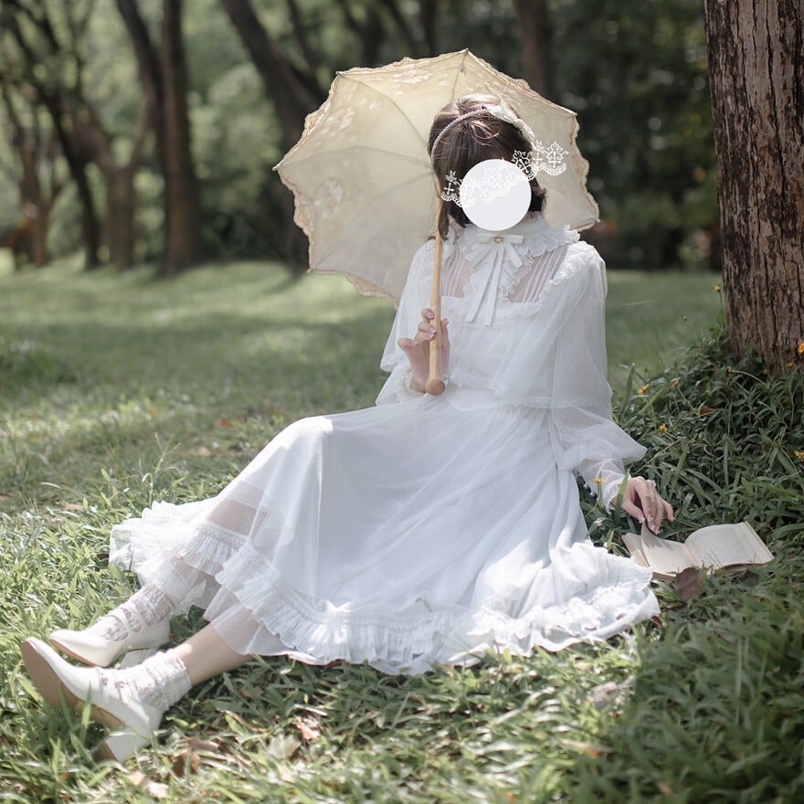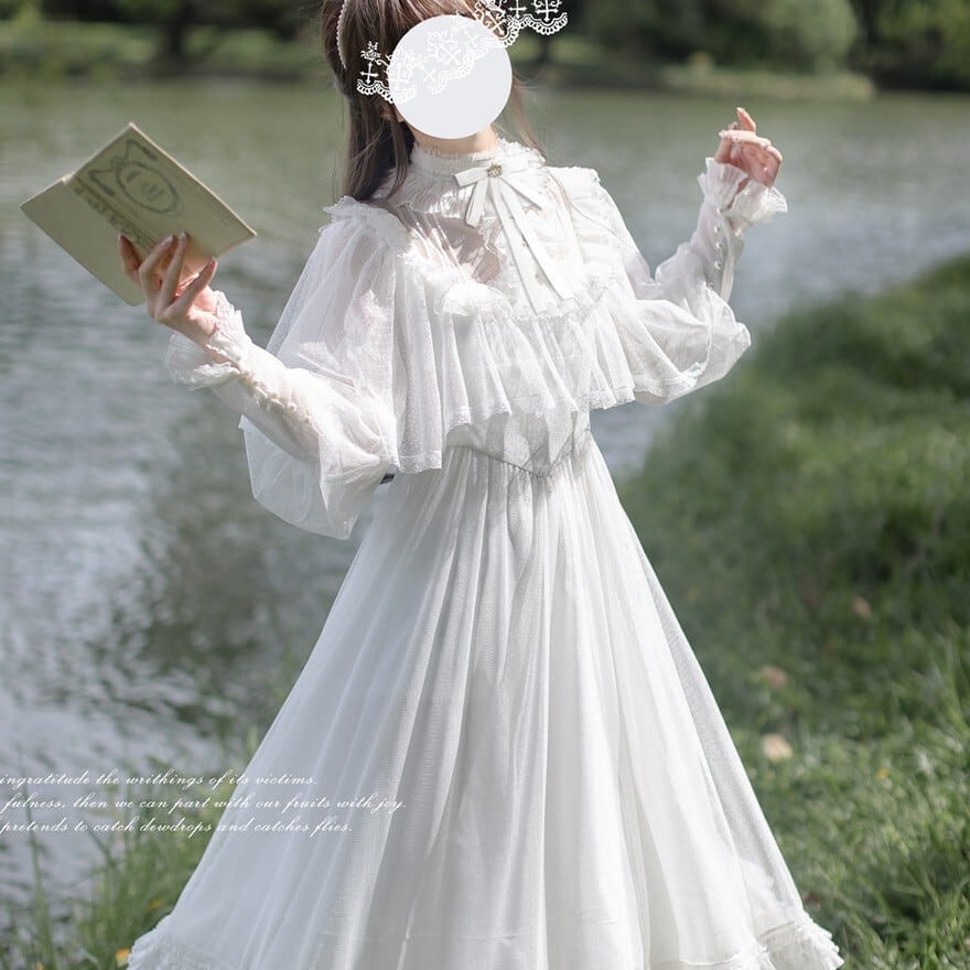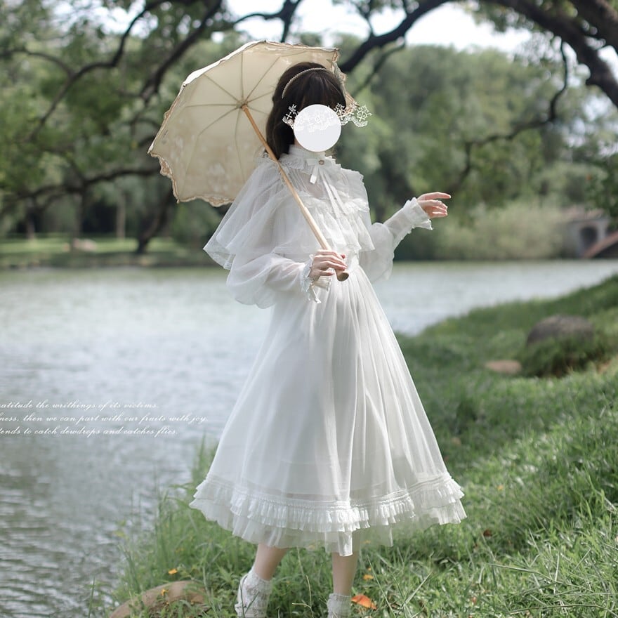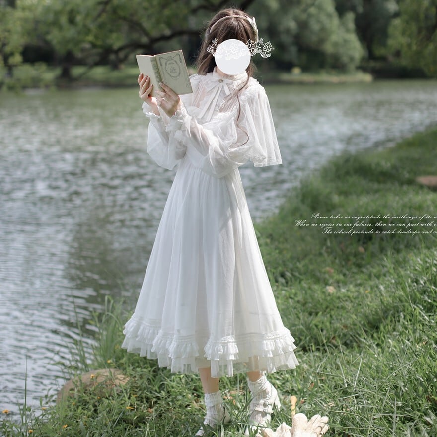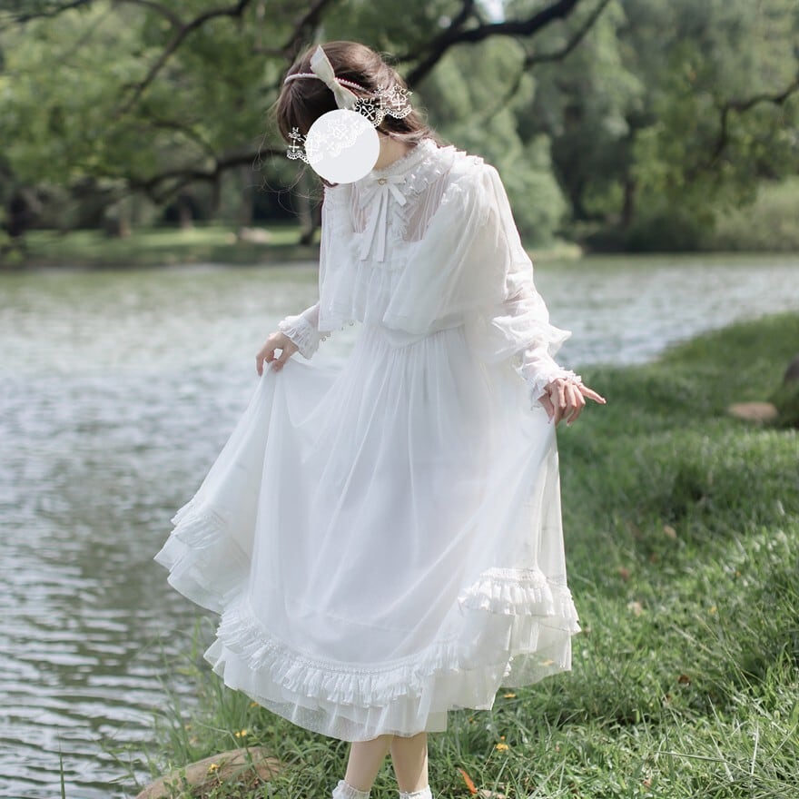 透け感のある長袖と大きめフリル襟が印象的な、純白のクラシカルロリィタワンピース。胸元のリボンと段フリルのミモレ丈スカートが上品な広がりを演出します。湖畔ロケーションにも映える軽やかな質感で、甘さを抑えた清楚な装いを完成させます。