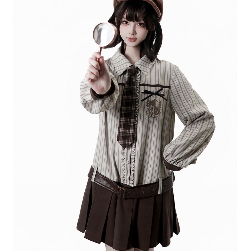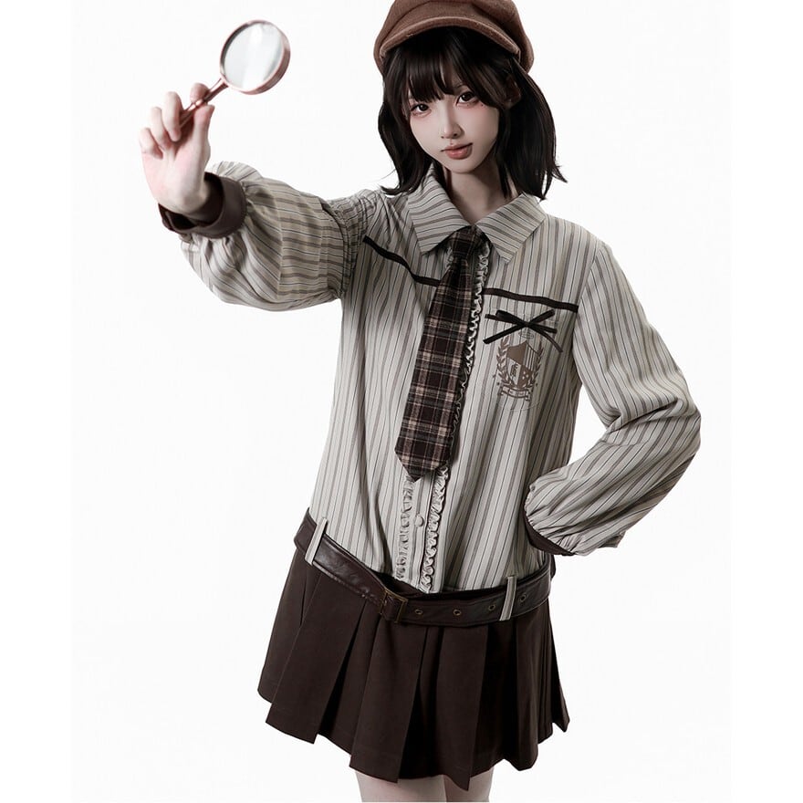 ブラウン系チェック柄を採用したスチームパンクテイストのネクタイ。首元はストラップ式で長さ調節が可能な仕様。クラシカルな配色と程よいボリューム感で、王子系ロリィタやマニッシュコーデに取り入れやすいアクセサリーです。
