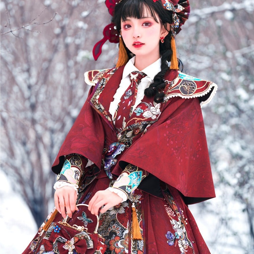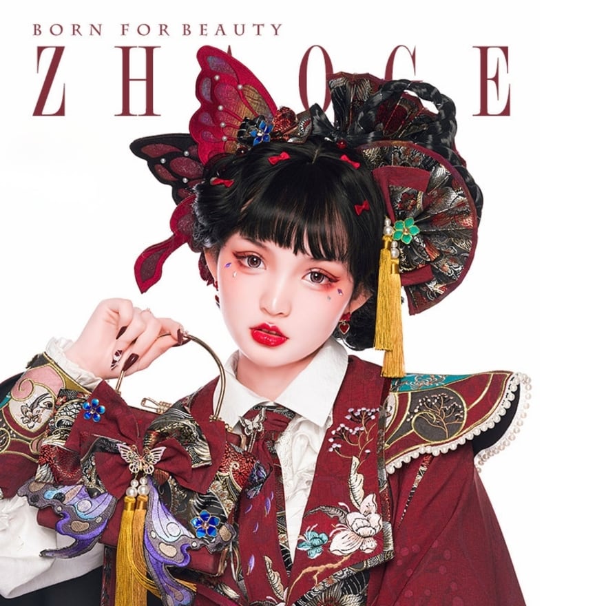 甘ロリのリボン中心デザインよりも装飾性と重厚感が強く、クラロリよりも華やか。ゴスロリほど黒主体ではなく、王子系の直線的シルエットとも異なります。中華ロリィタ特有の刺繍・対称構造を強調するアクセントアイテムという立ち位置です。