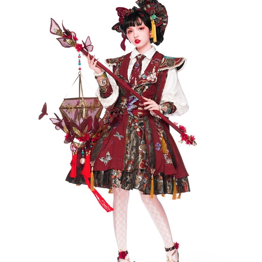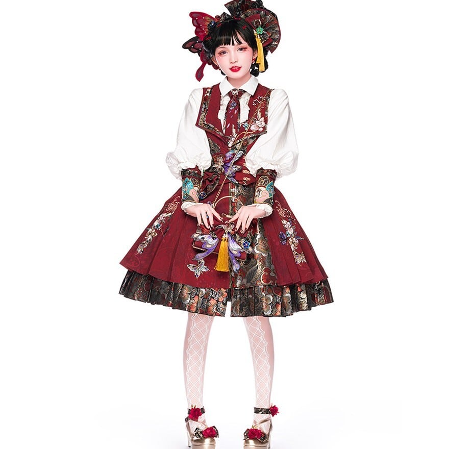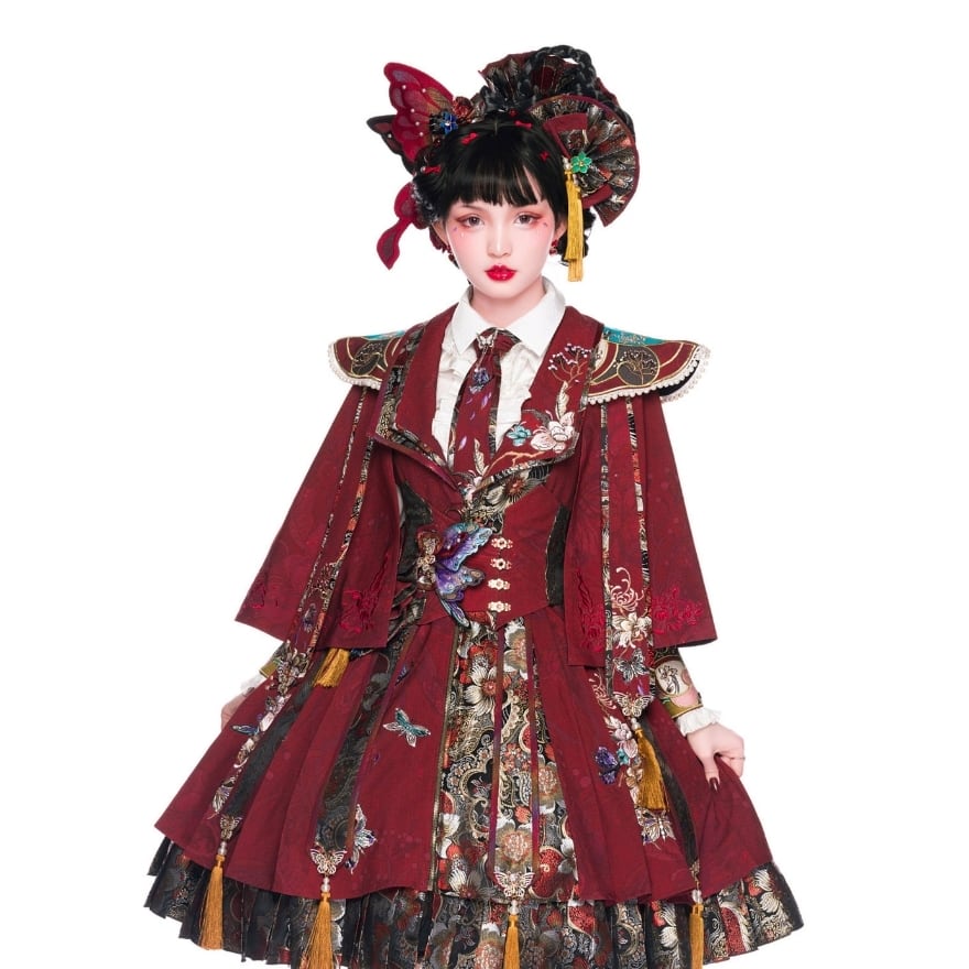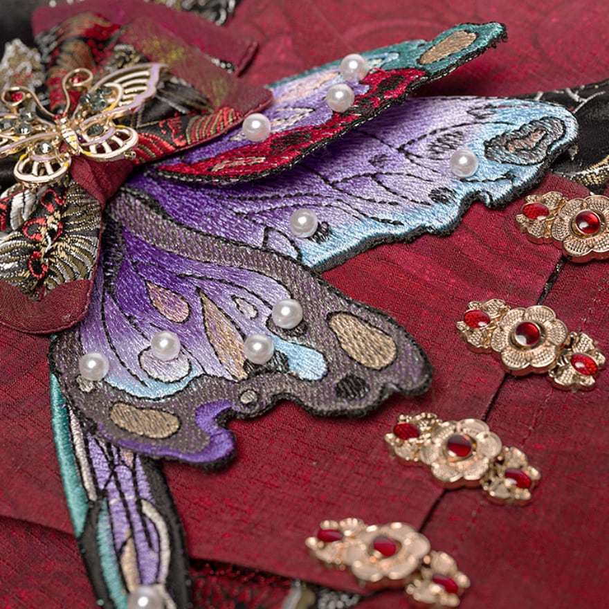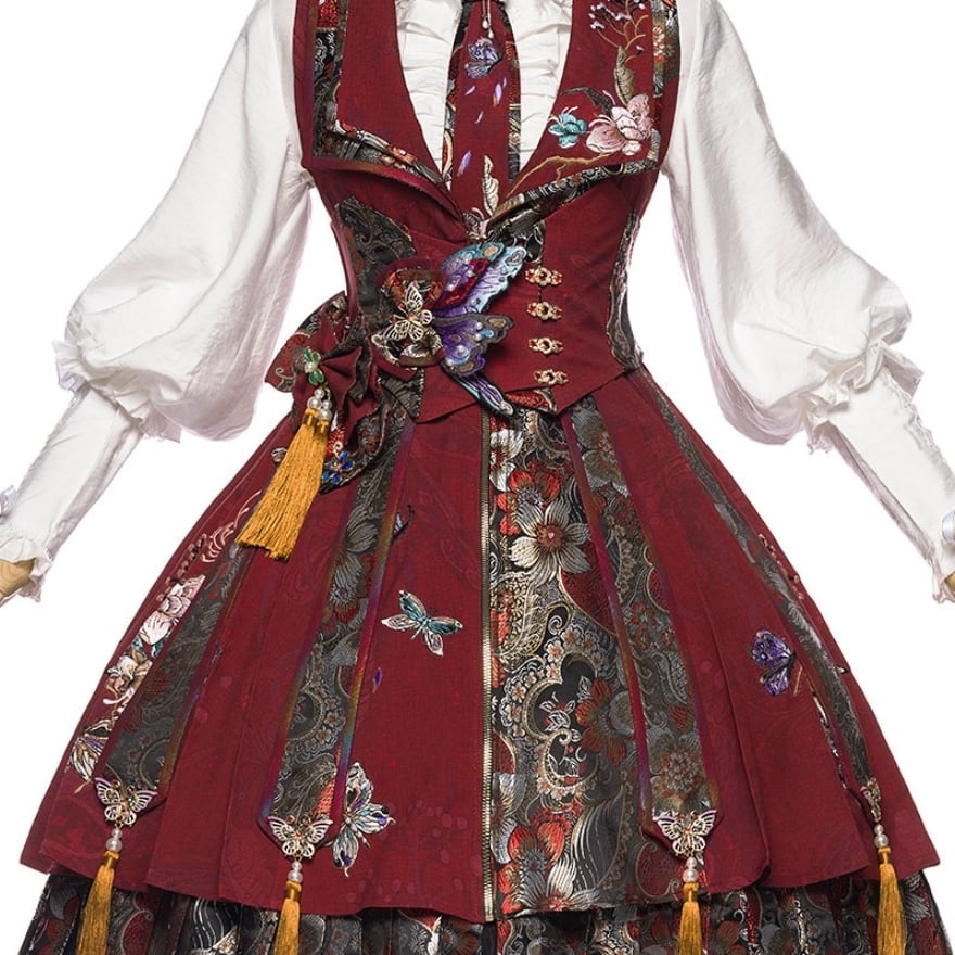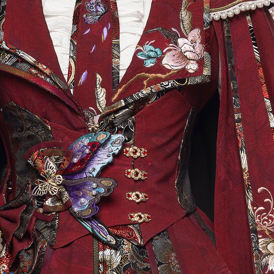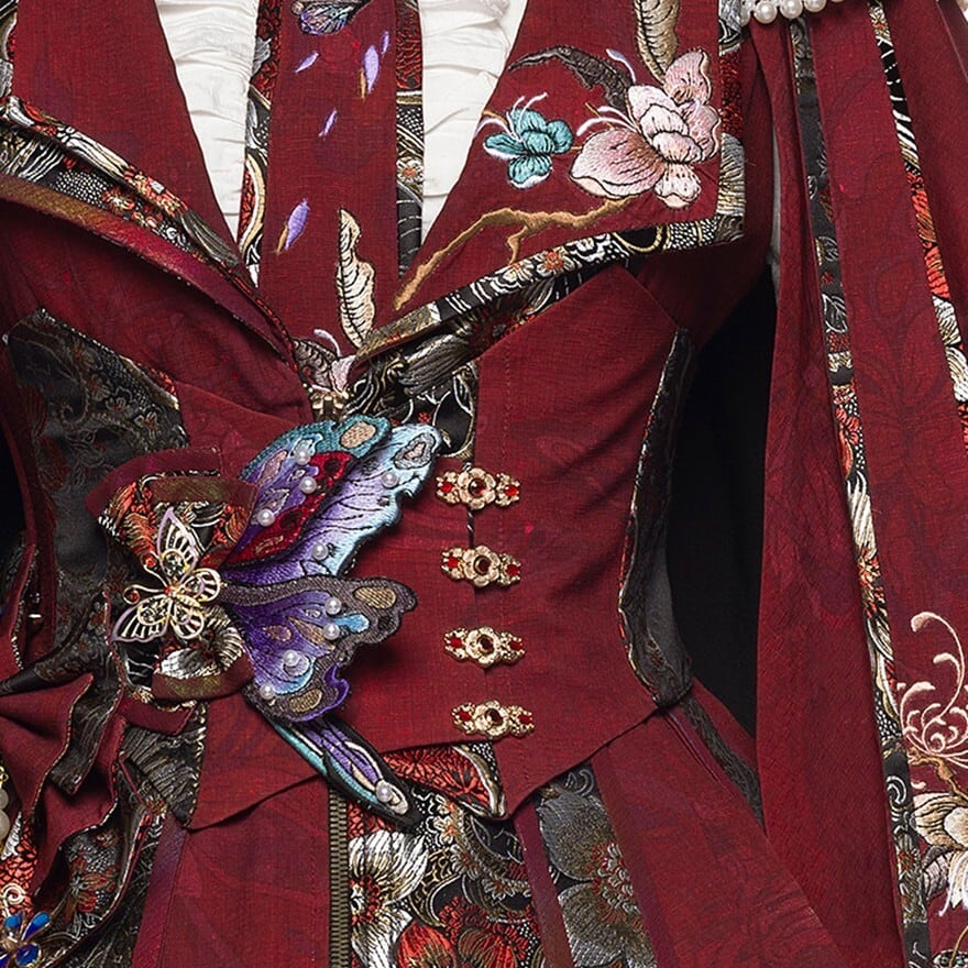 中華ロリータ 蝶ブローチ付きウエストベルト|深紅×刺繍ジャカードの華やかコルセット風|SEASONZ
