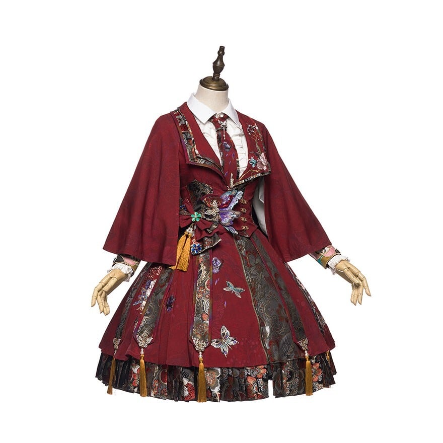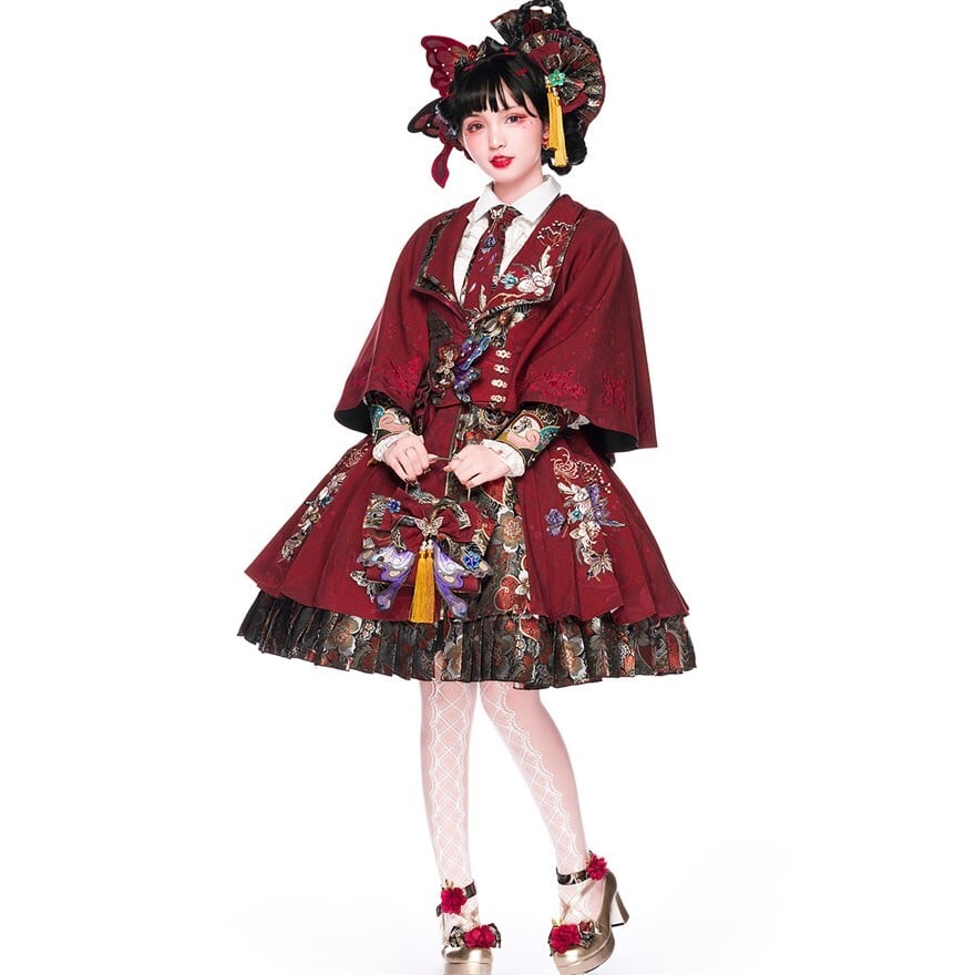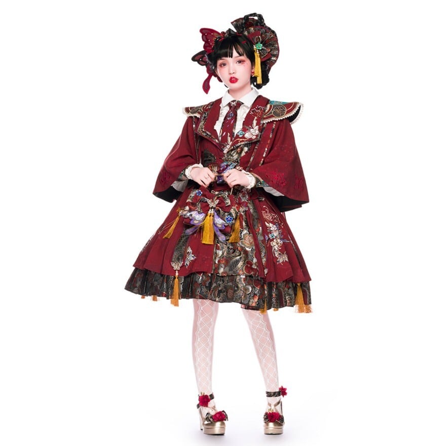 中華ロリィタ フルセット(JSK+ブラウス+ウエストベルト+雲肩+ヘアドレスA/B)刺繍ジャカード レッド|SEASONZ