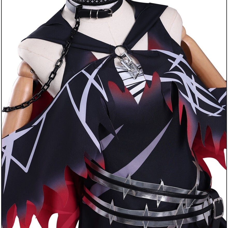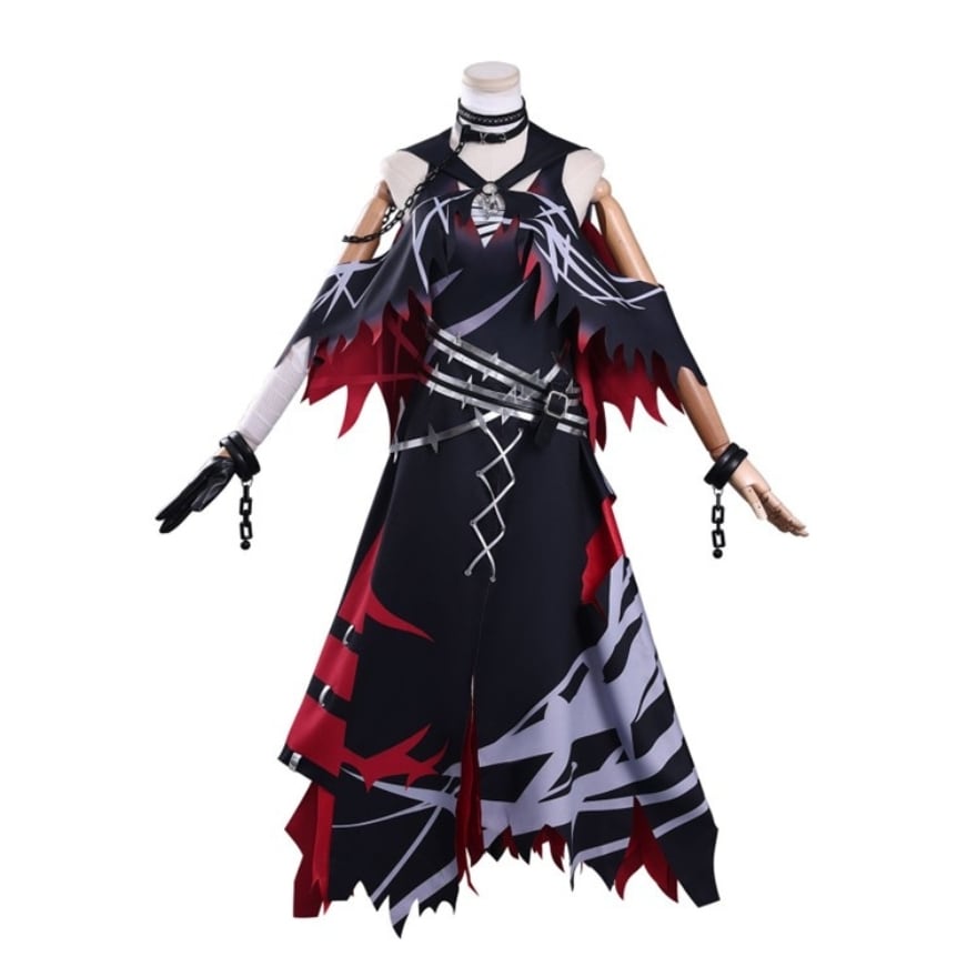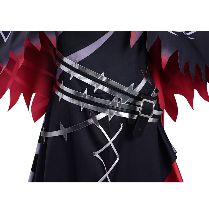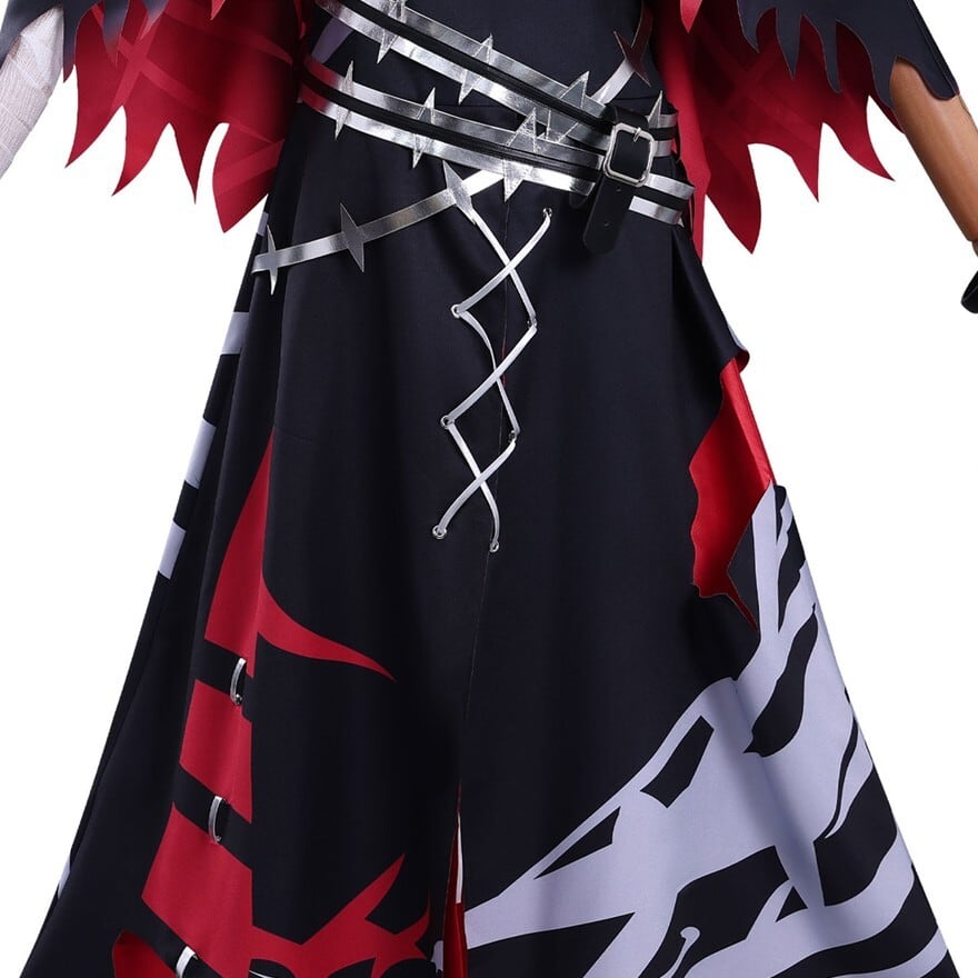 ブラックを基調にレッドグラデーションとシルバー調ラインプリントを配した魔法少女ファンタジーコスチューム。フード付きショール、ホルターデザイン風ワンピース、ベルトやチョーカーなど複数アクセサリーが含まれたセット構成。裾はギザギザカットで動きのあるシルエットを演出します。