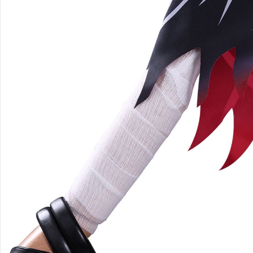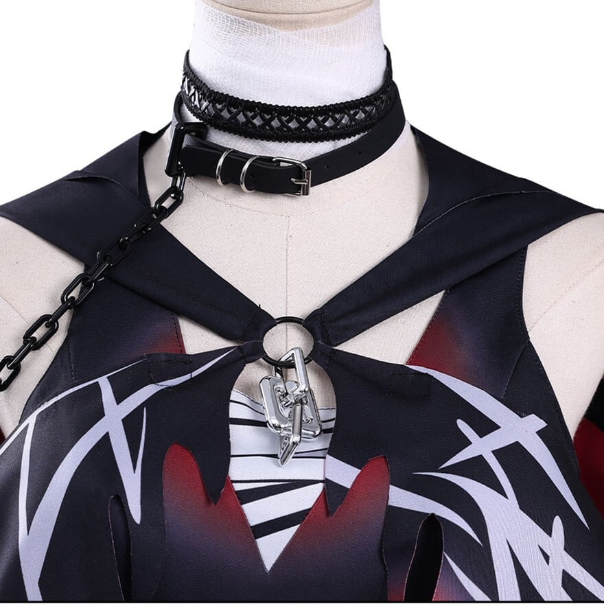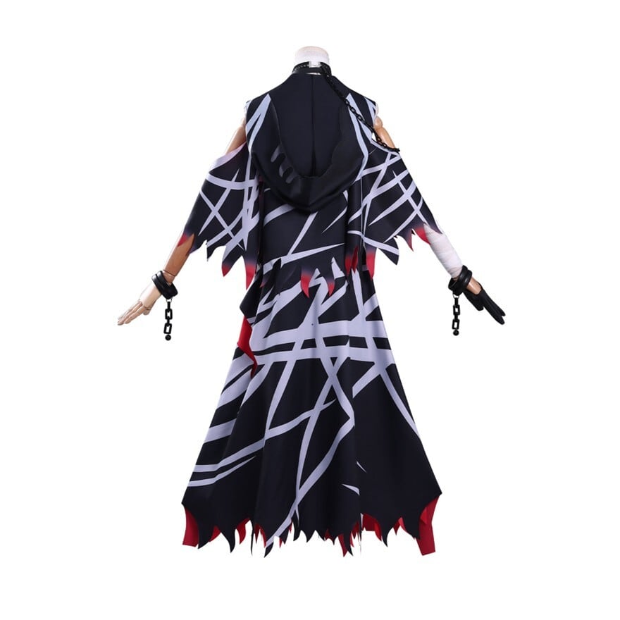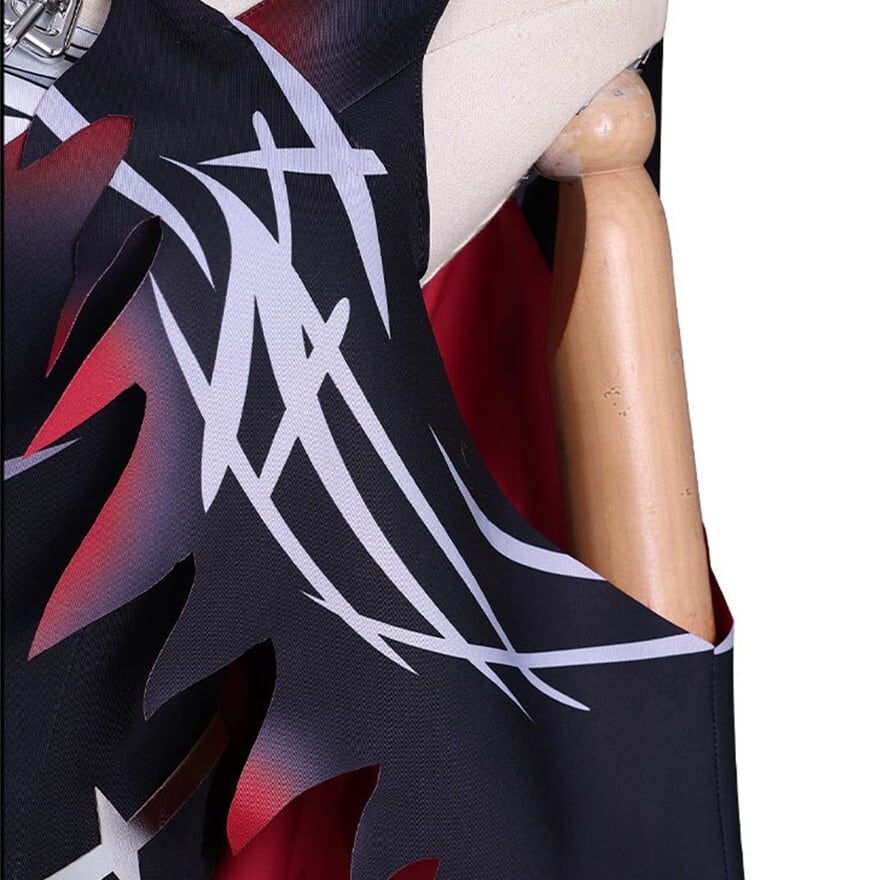 ブラックを基調にレッドグラデーションとシルバー調ラインプリントを配した魔法少女ファンタジーコスチューム。フード付きショール、ホルターデザイン風ワンピース、ベルトやチョーカーなど複数アクセサリーが含まれたセット構成。裾はギザギザカットで動きのあるシルエットを演出します。