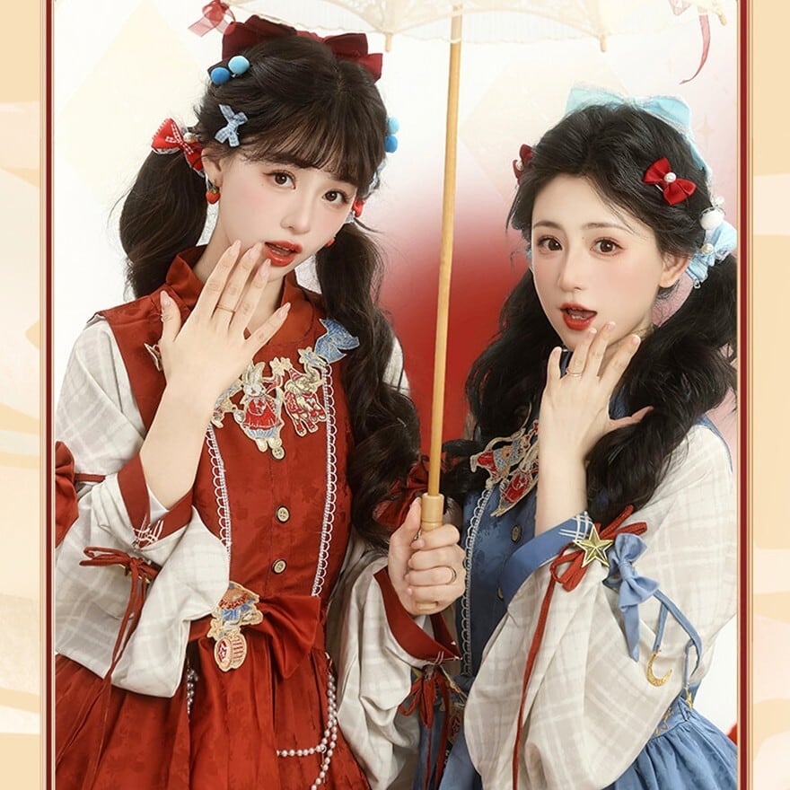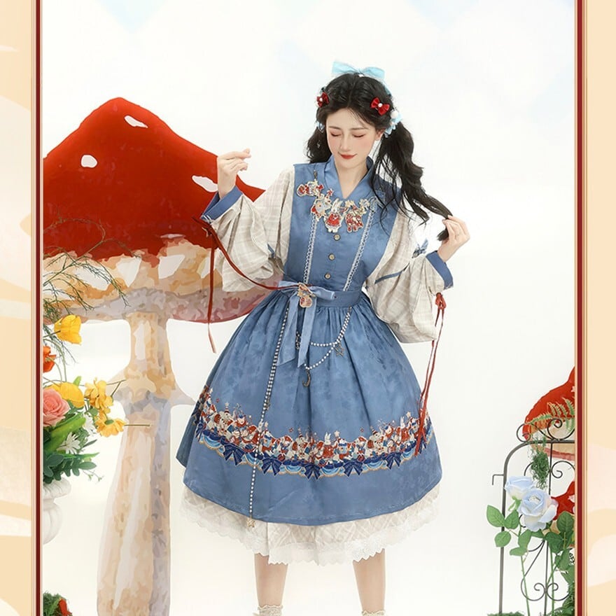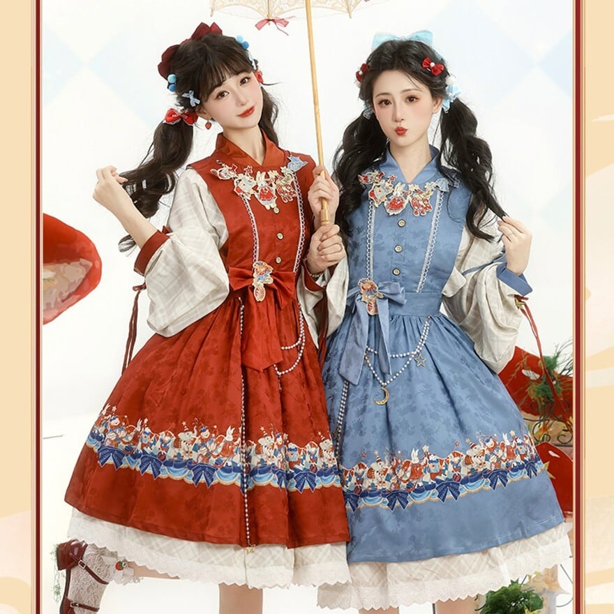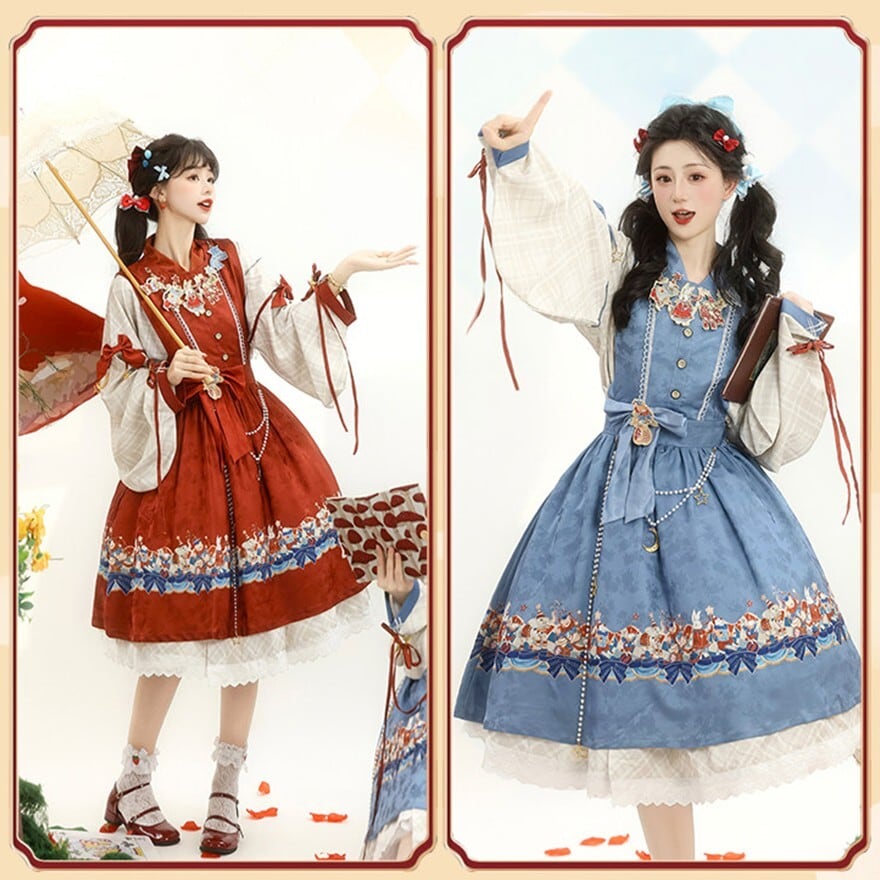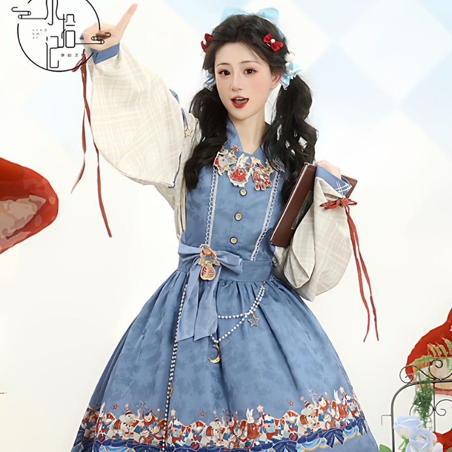 裾に物語風のイラストプリントをあしらった中華ロリータのジャンパースカートとブラウスの2点セット。フロントボタン仕様のJSKにウエストリボンを組み合わせ、タック入りの膝丈シルエットを形成。ブラウスは配色カフスとリボン装飾付きで、重ね着による立体感が特徴。日常使いから撮影まで対応できる構成です。