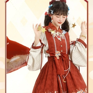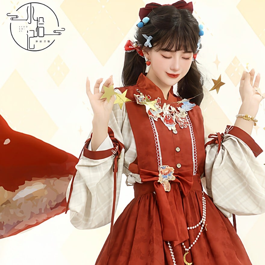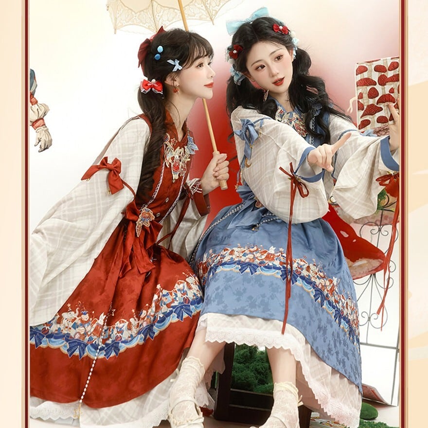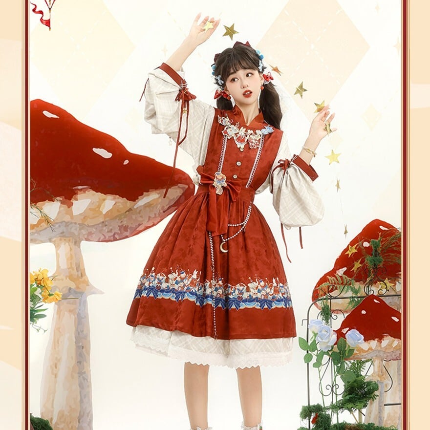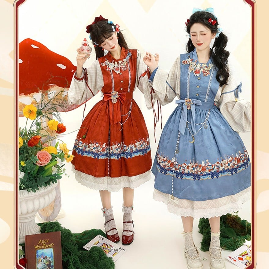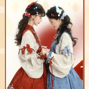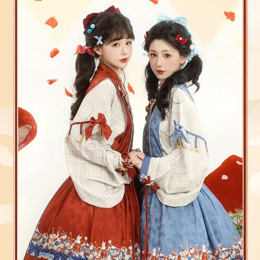 裾に物語風のイラストプリントをあしらった中華ロリータのジャンパースカートとブラウスの2点セット。フロントボタン仕様のJSKにウエストリボンを組み合わせ、タック入りの膝丈シルエットを形成。ブラウスは配色カフスとリボン装飾付きで、重ね着による立体感が特徴。日常使いから撮影まで対応できる構成です。