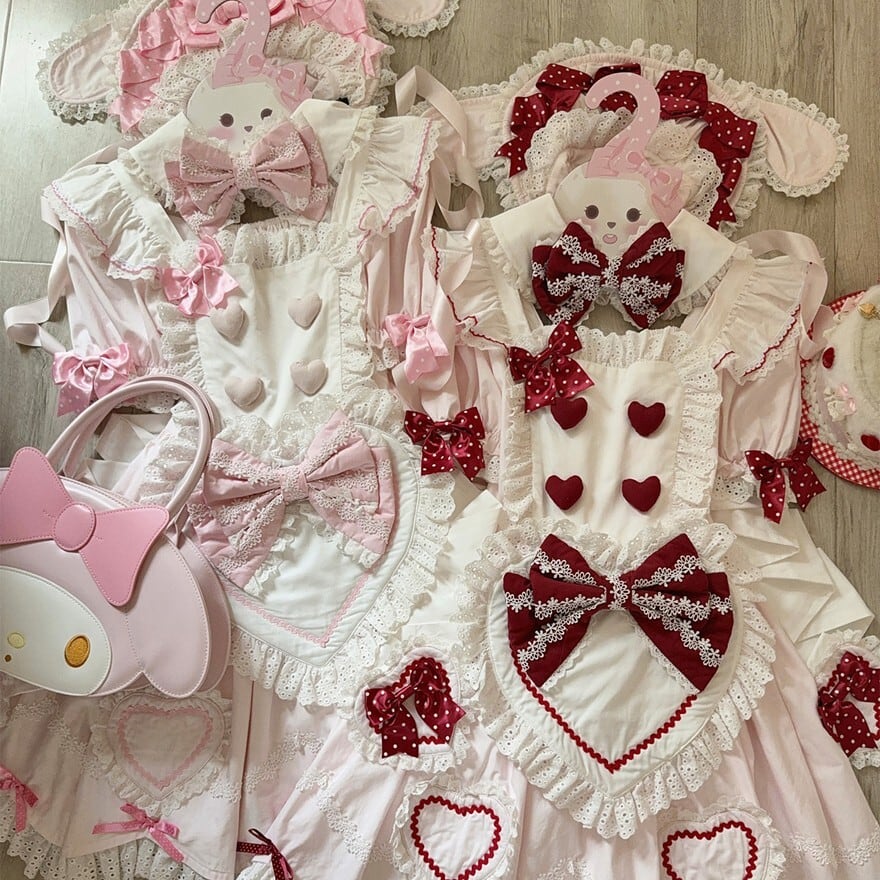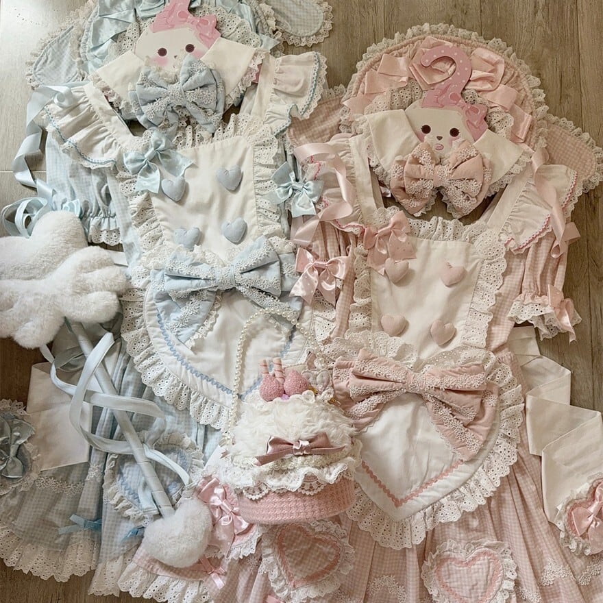 • エプロン:中央に大きなハートデザインを配したレースフリル付きエプロン。リボン装飾がアクセント。
