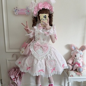 • ワンピース:フリルを多用した半袖メイドワンピース。胸元には立体的なハート装飾が配置されています。
