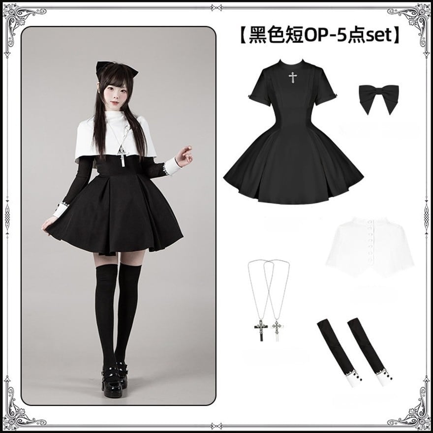 静かな聖堂から抜け出してきたような、神秘的な気配をまとったゴシックロリータのミニワンピースセットです。修道女を思わせるシンプルで整ったシルエットに、クロスモチーフのアクセサリーやケープ風ディテールが重なり、清廉さとゴシックの気配が同時に漂います。ひとつの物語の登場人物のような佇まいをつくる、完成度の高い5点セットです。