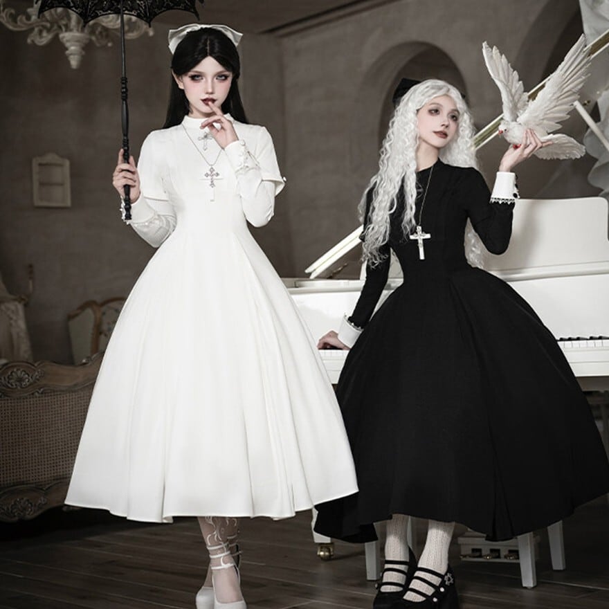 ゴシックの世界では、清らかさと影の気配が同時に存在します。修道女の静謐な衣装を思わせるこのスタイルは、白と黒という対照的な色の中でその美しさを際立たせます。静かな祈りの時間のような空気をまといながら、撮影やステージの場でひときわ印象に残る存在になります。