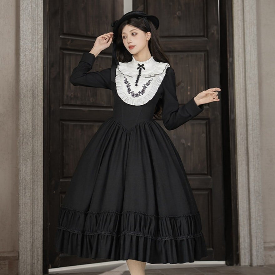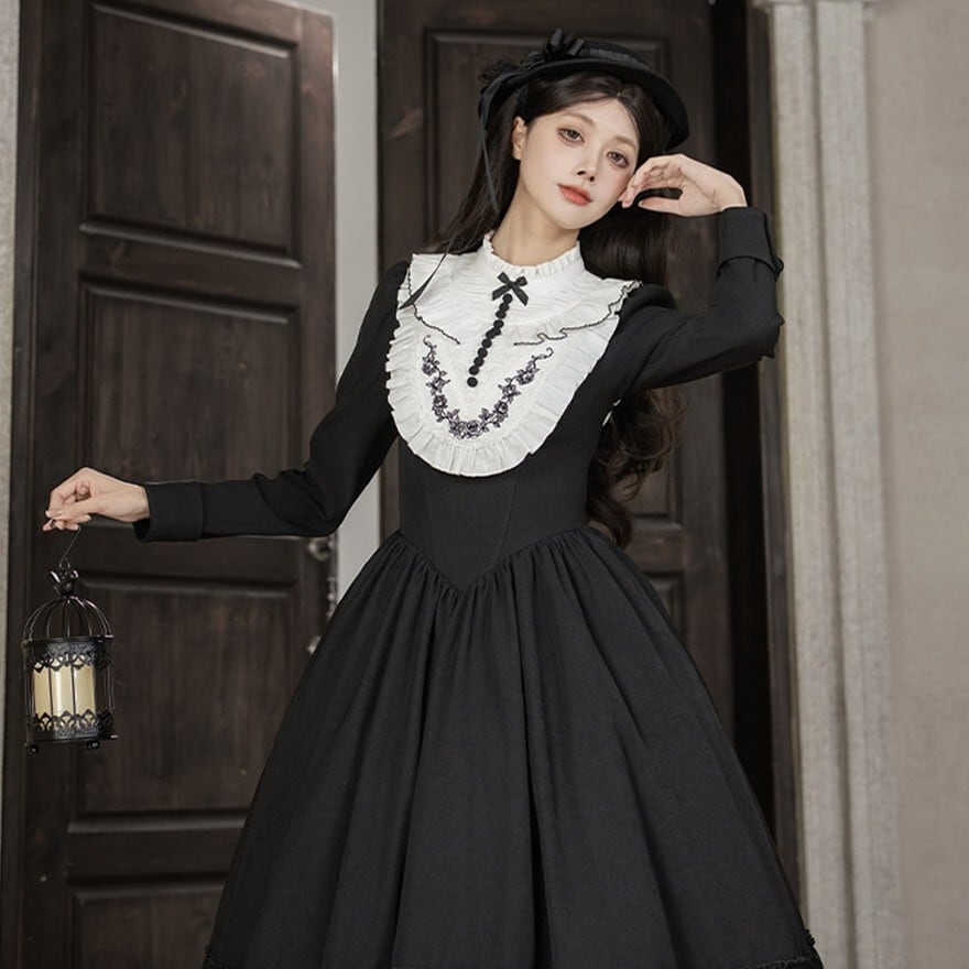 静かな礼拝堂からそのまま歩み出てきたような、凛とした空気を纏うゴスロリロングワンピースです。深い黒で構成されたドレスに、白い偽襟が浮かび上がるコントラスト。背中の編み上げや裾のフリルが重なり、厳かな修道女のイメージとロリータの華やかさが静かに交差します。ワンピース・偽襟・ベレー帽の3点で完成する、物語性の強いスタイルです。