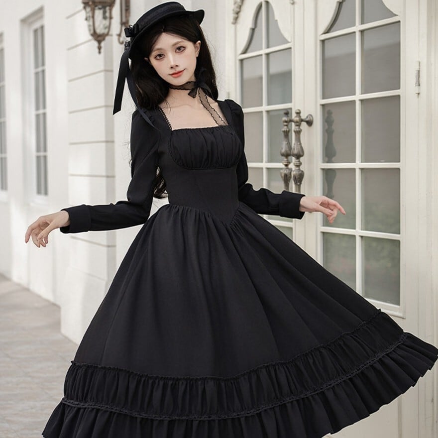 • ワンピース:ブラックのロング丈ワンピース。スクエアネックと長袖でクラシカルなシルエット。