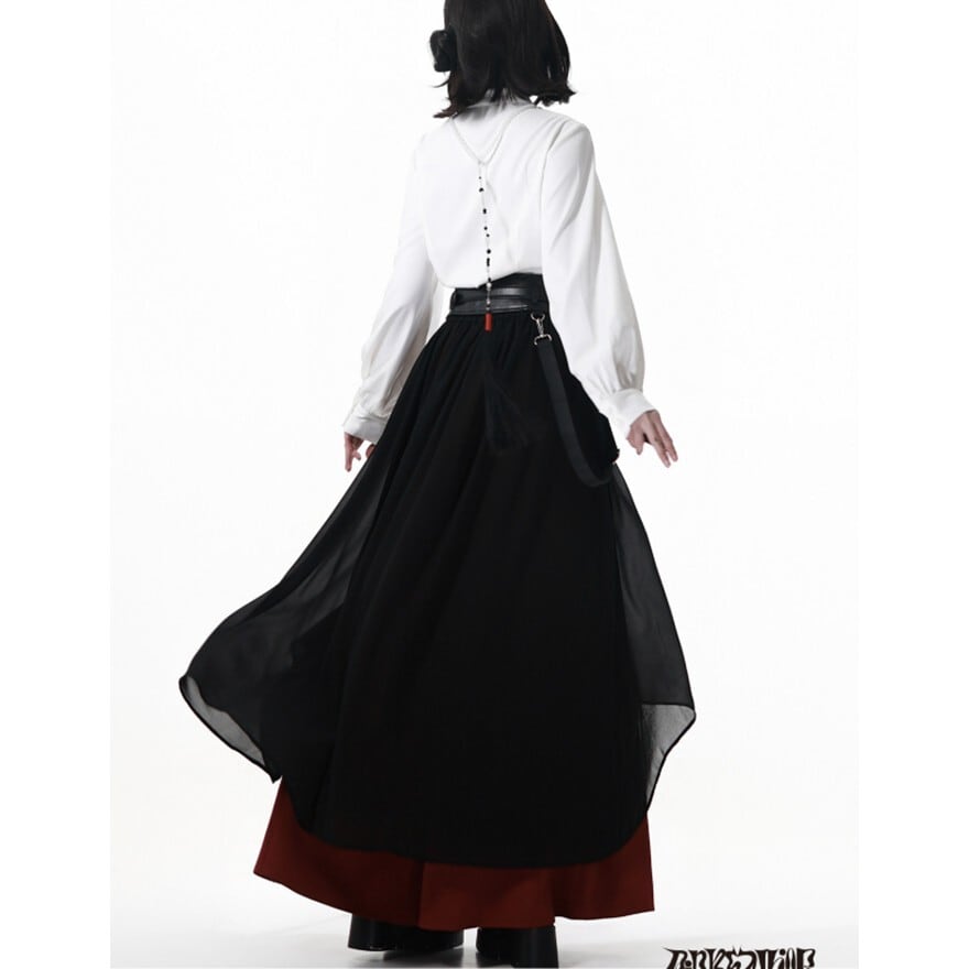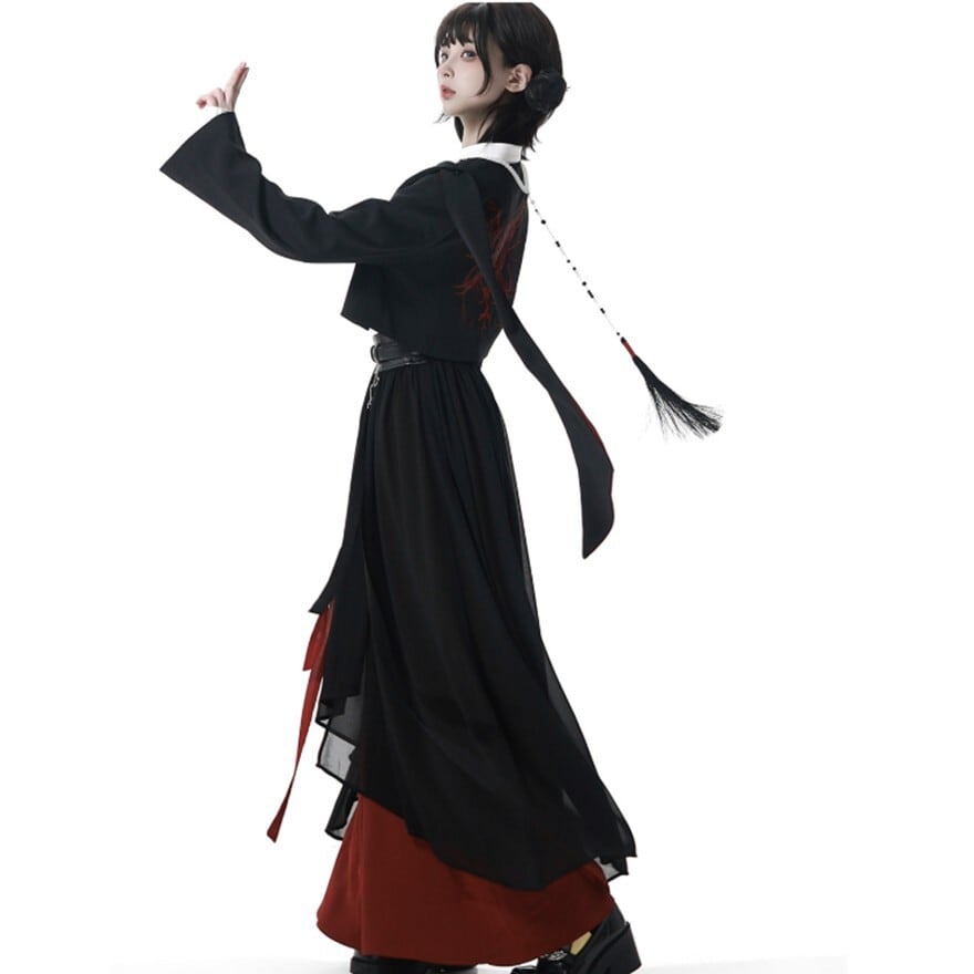 静かな闇のような黒と、感情を滲ませる深い赤。その対比が印象に残る地雷系セットアップです。ショート丈ジャケットとロングシルエットの配色パンツが生む縦ラインが、独特の存在感を作り出す。白シャツの刺繍ディテールとウエストベルトのアクセントが、全体の空気感を引き締めます。