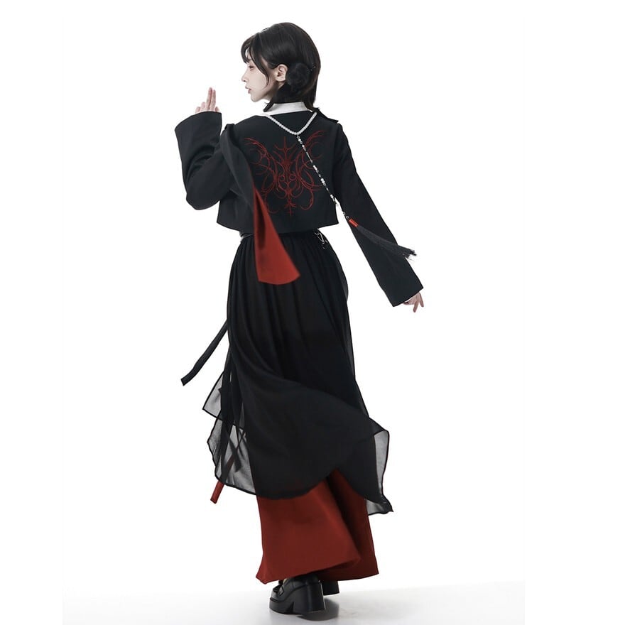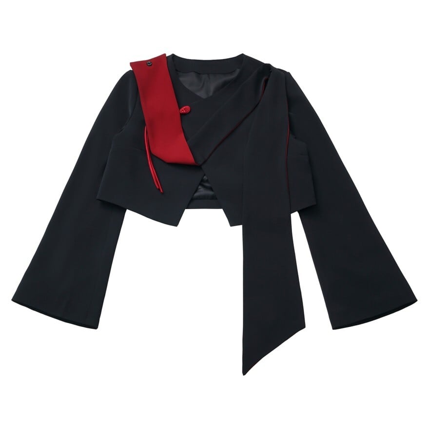黒の静けさの上に、ふいに差し込む赤いライン。そのコントラストが、地雷系ファッション特有の繊細な感情の揺れを映し出すショート丈ジャケットです。短く切り取られたシルエットと、片側に流れるデザインパーツが視線を引き寄せる。シンプルでありながら、纏った瞬間に世界観が立ち上がる一着です。