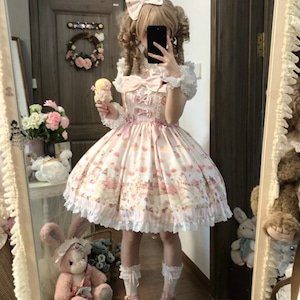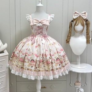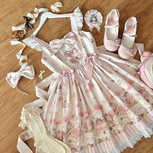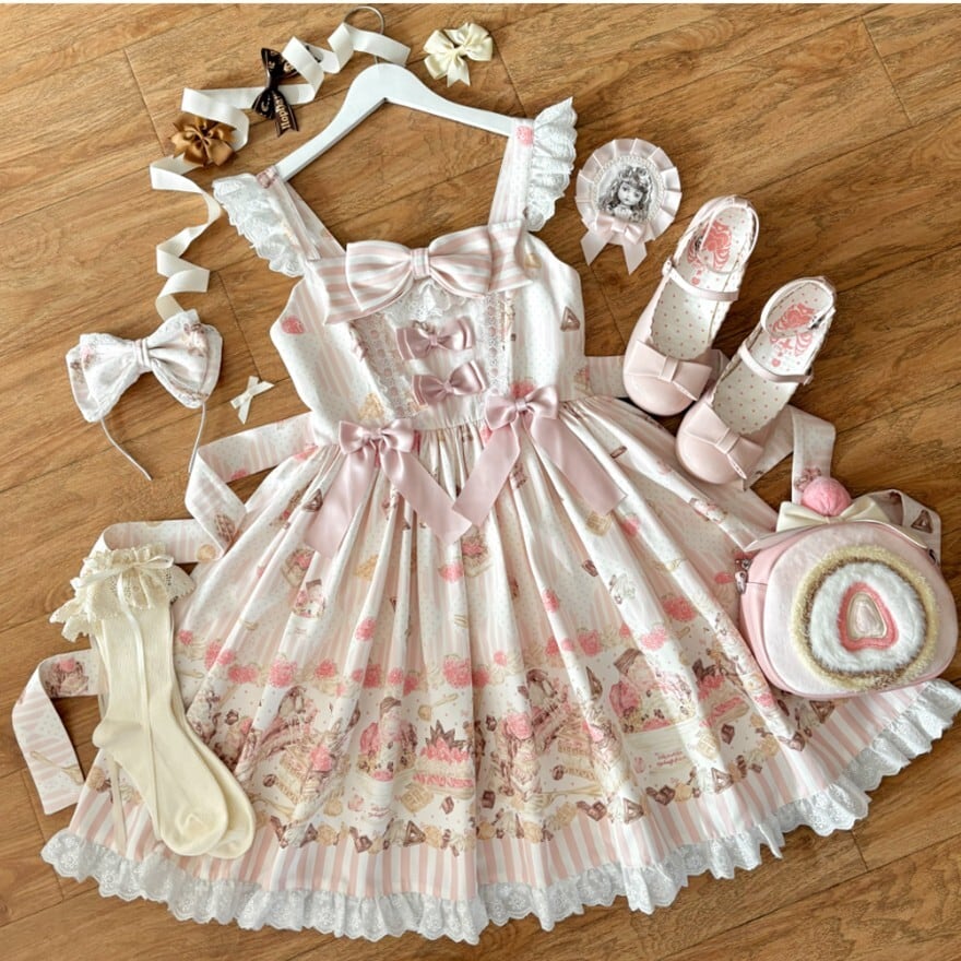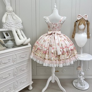 まるで絵本の1ページから抜け出してきたような、柔らかなピンクの世界に包まれるジャンパースカートです。裾いっぱいに広がるクマのモチーフとリボンの装飾が、ロリータスタイルの可憐な物語性を際立たせます。胸元の大きなリボンと繊細なフリルが重なり、着た瞬間にドールのようなシルエットを描く一着です。