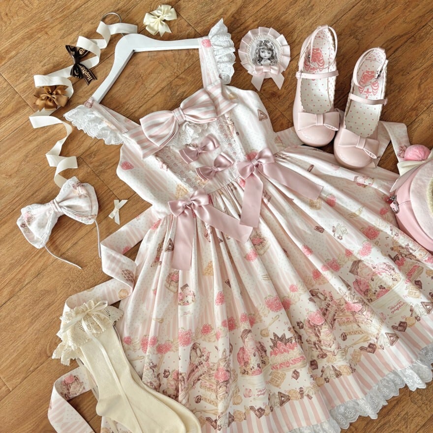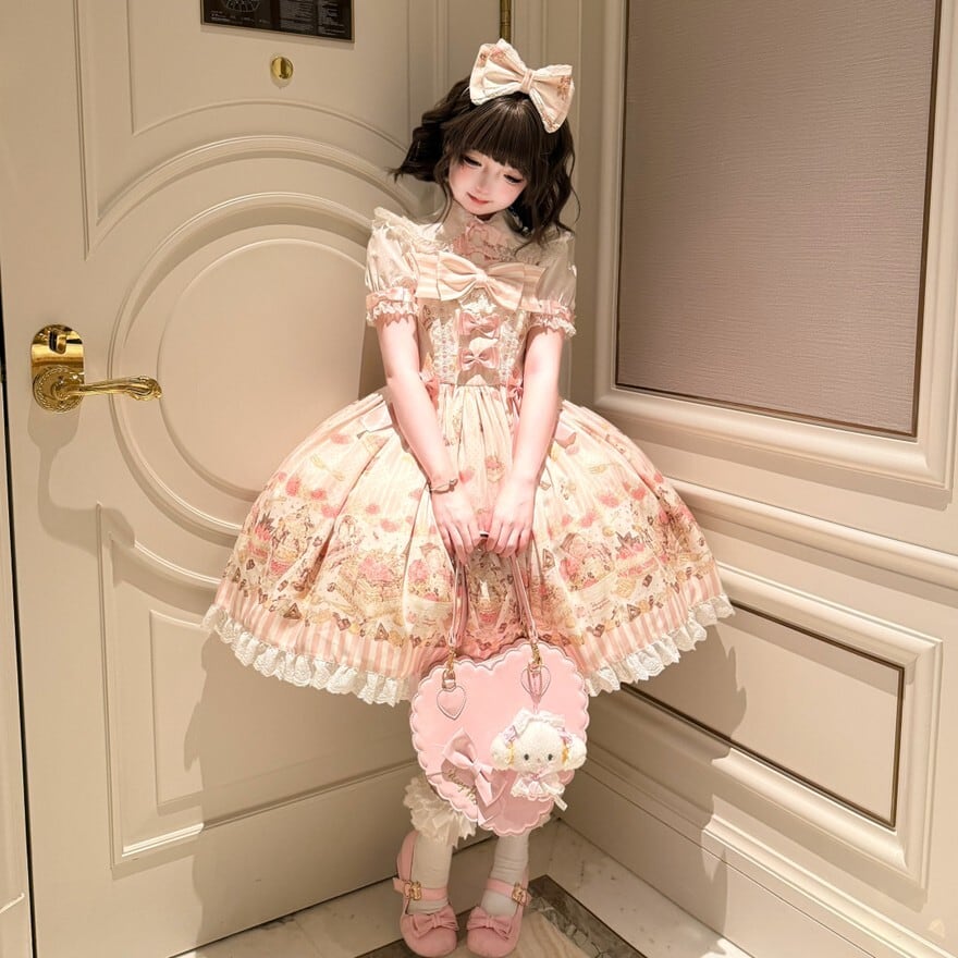 やさしいピンクの配色とクラシカルなシルエットが、落ち着いたロリータコーデにも自然に溶け込みます。