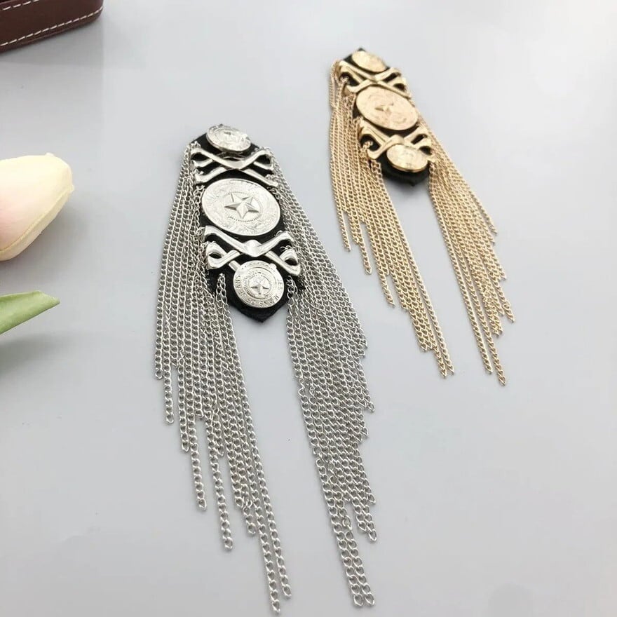 A. 同シリーズには「三連星×チェーンタッセル」「ラインストーン全面タッセル」もございます。本商品はコイン紋章×交差剣モチーフで、三点の中で最も重厚でクラシックな将校スタイルに仕上がります。シーンや衣装の雰囲気に合わせてお選びください。