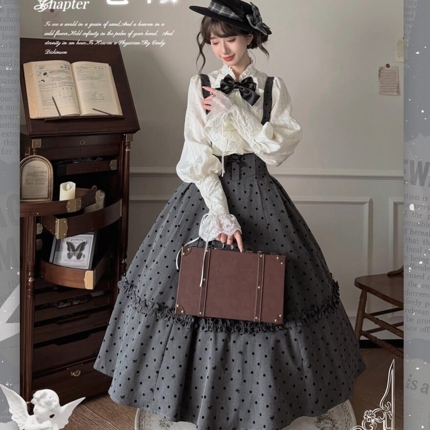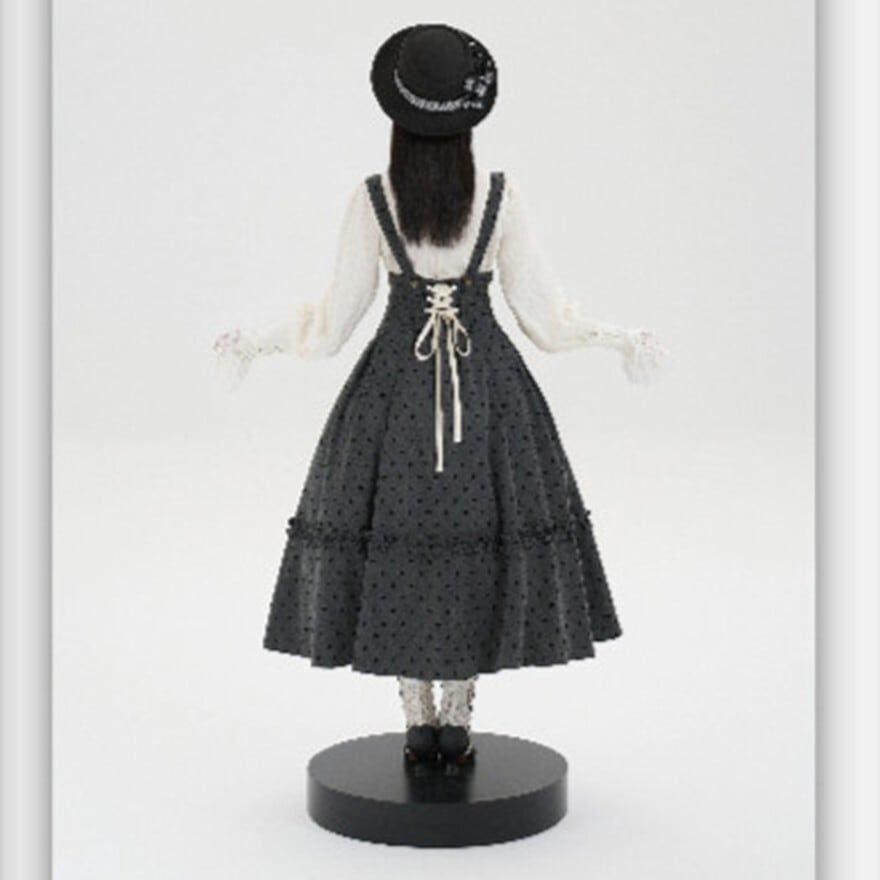 クラシカルロリータが持つ魅力は、静かな品格と甘やかな装飾の均衡にあります。黒いドットが整然と並ぶスカートは、古い洋館の午後を思わせる落ち着いた空気をまとい、フリルブラウスの柔らかな白がその静けさに光を添える。お茶会でも撮影会でも、この装いは穏やかな物語の一頁のように佇みます。