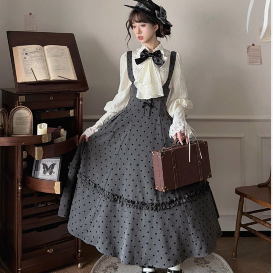細かなドット柄のジャンパースカートと、胸元のラッフルが印象的なブラウスの組み合わせが、落ち着いた気品と少女的な可憐さを同時に引き出します。