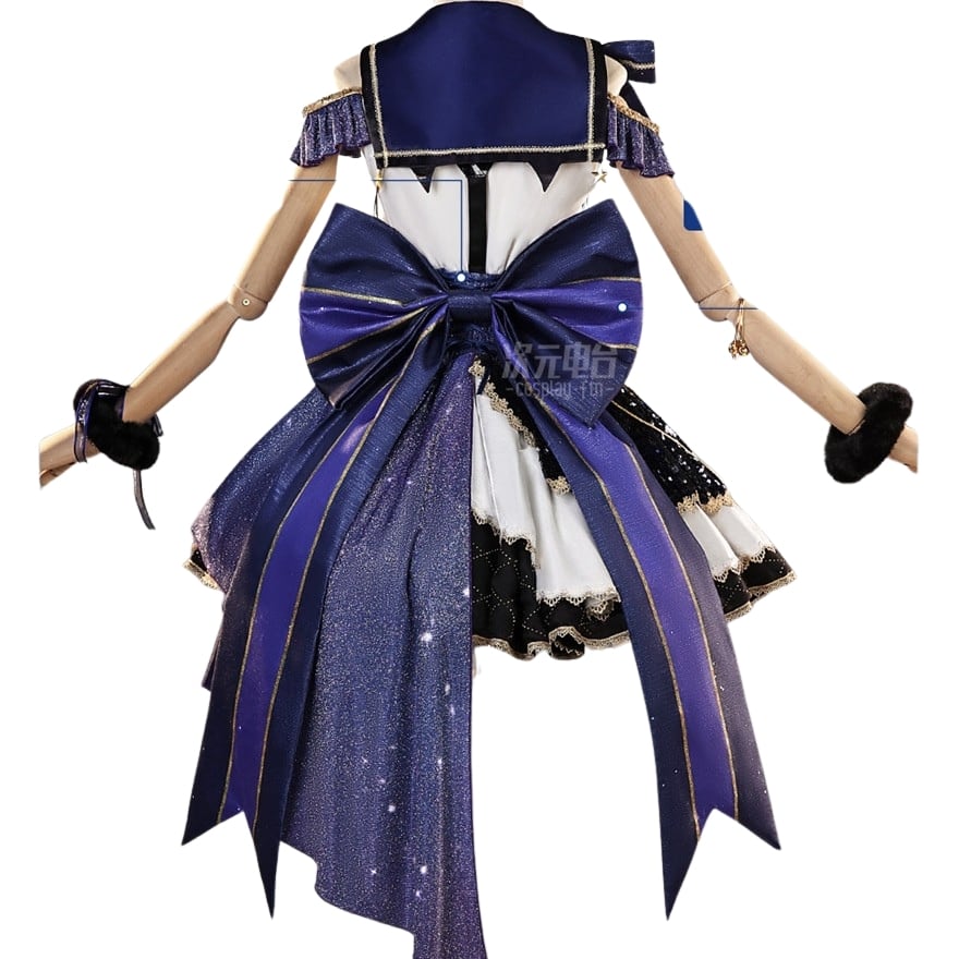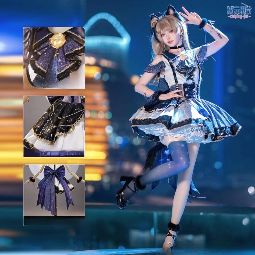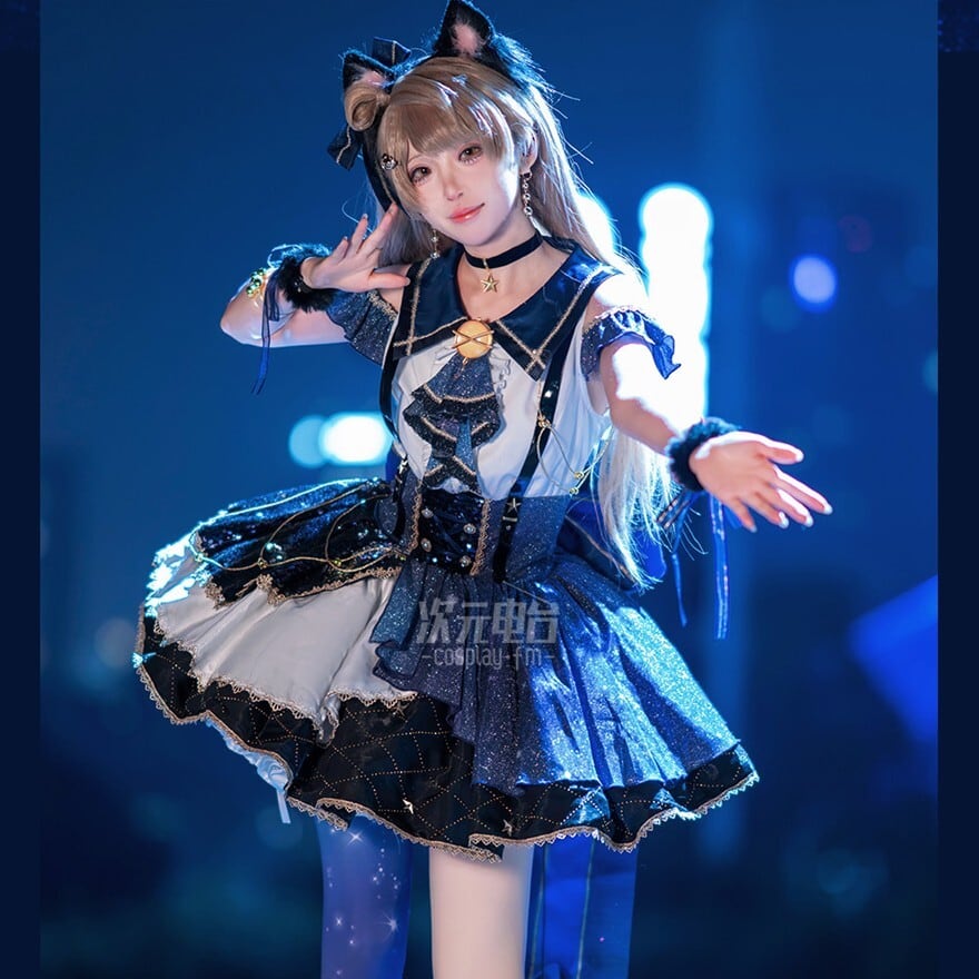 夜のステージに星が降りたようなきらめきを纏う、猫モチーフのアイドル衣装です。深いネイビーを基調に、星のチャームやリボン装飾が光を受けて輝きます。ふわりと広がるスカートと肩を彩るフリルが動きに合わせて揺れ、ライブや撮影会で印象的なシルエットを描くコスチュームです。