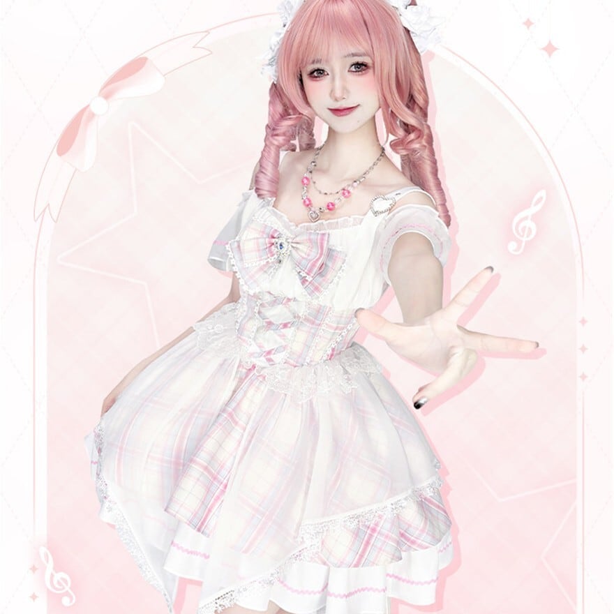 ライトが当たるたび、スカートのフリルがふわりと揺れる——そんな瞬間を思わせるピンクチェックのアイドルステージ衣装です。胸元の大きなリボンと、コルセット風に編み上げられたウエストデザインが、可憐さと舞台映えの存在感を同時に引き出します。軽やかに広がるスカートが、動くたびに空気をまとい、ステージの上で物語のようなシルエットを描きます。