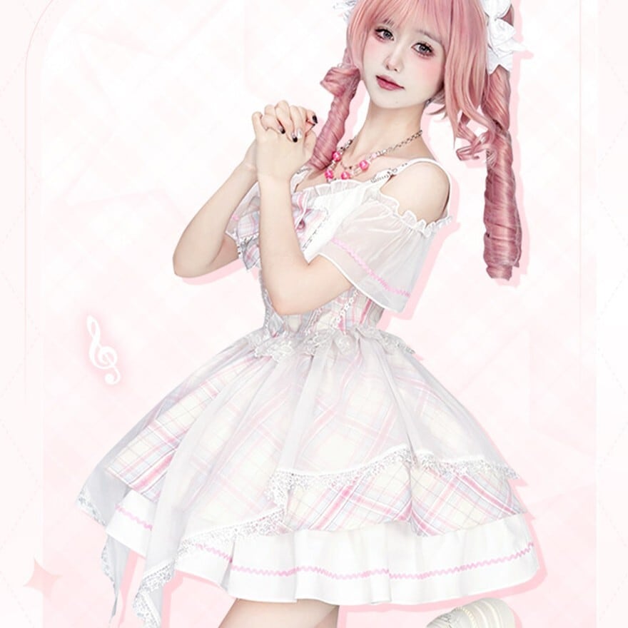 淡いピンクのチェックと幾重にも重なるフリルは、スポットライトの中で揺れるたびに、歓声と光をまとった一瞬の輝きをつくり出します。